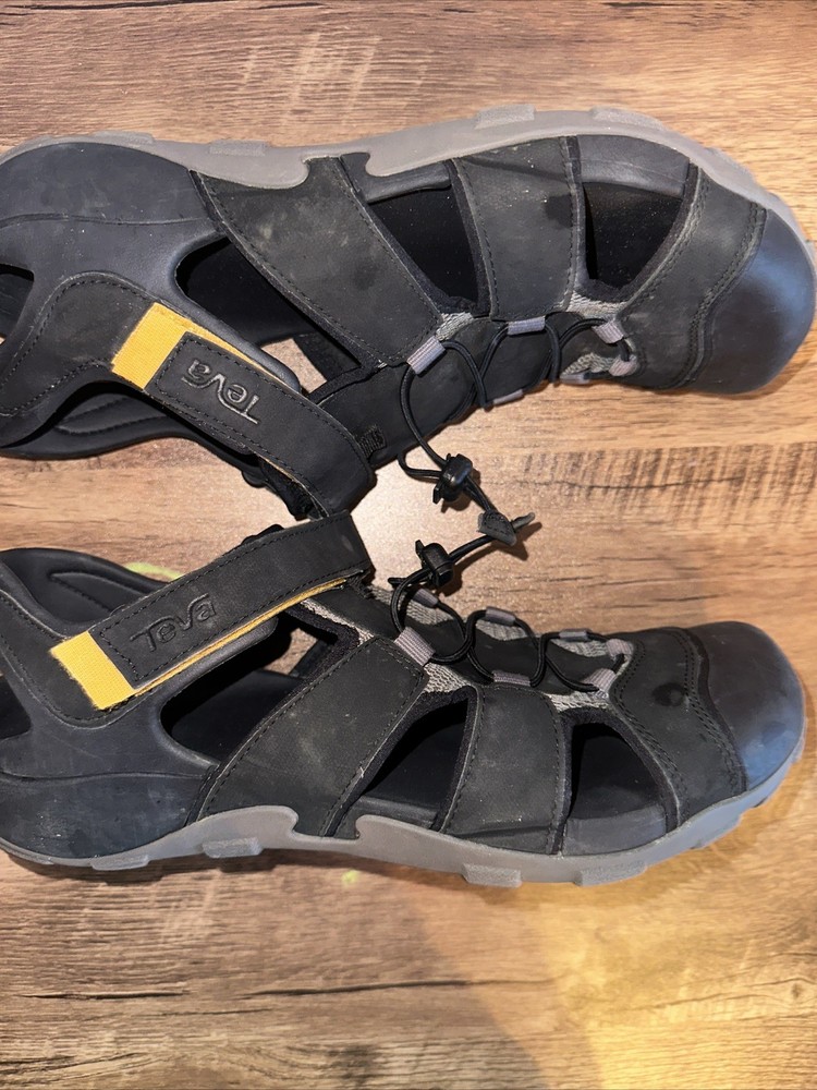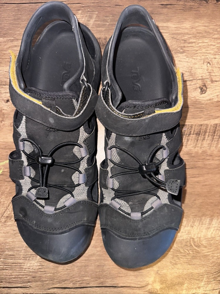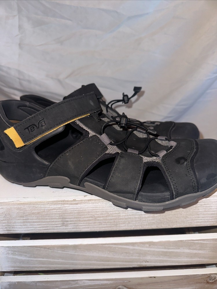 The Teva Men's Flintwood Sandals Shoes in black are perfect for hiking and outdoor activities. These fisherman-style sandals feature a closed toe design with a drawstring closure for a secure fit. Made with synthetic material and a rubber outsole, they provide comfort and durability on various terrains. The slip-on style and adjustable strap make them easy to wear for travel or activewear occasions. These Teva sandals are a stylish and functional choice for men looking for a reliable pair of outdoor footwear.