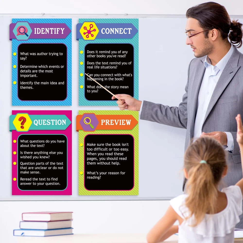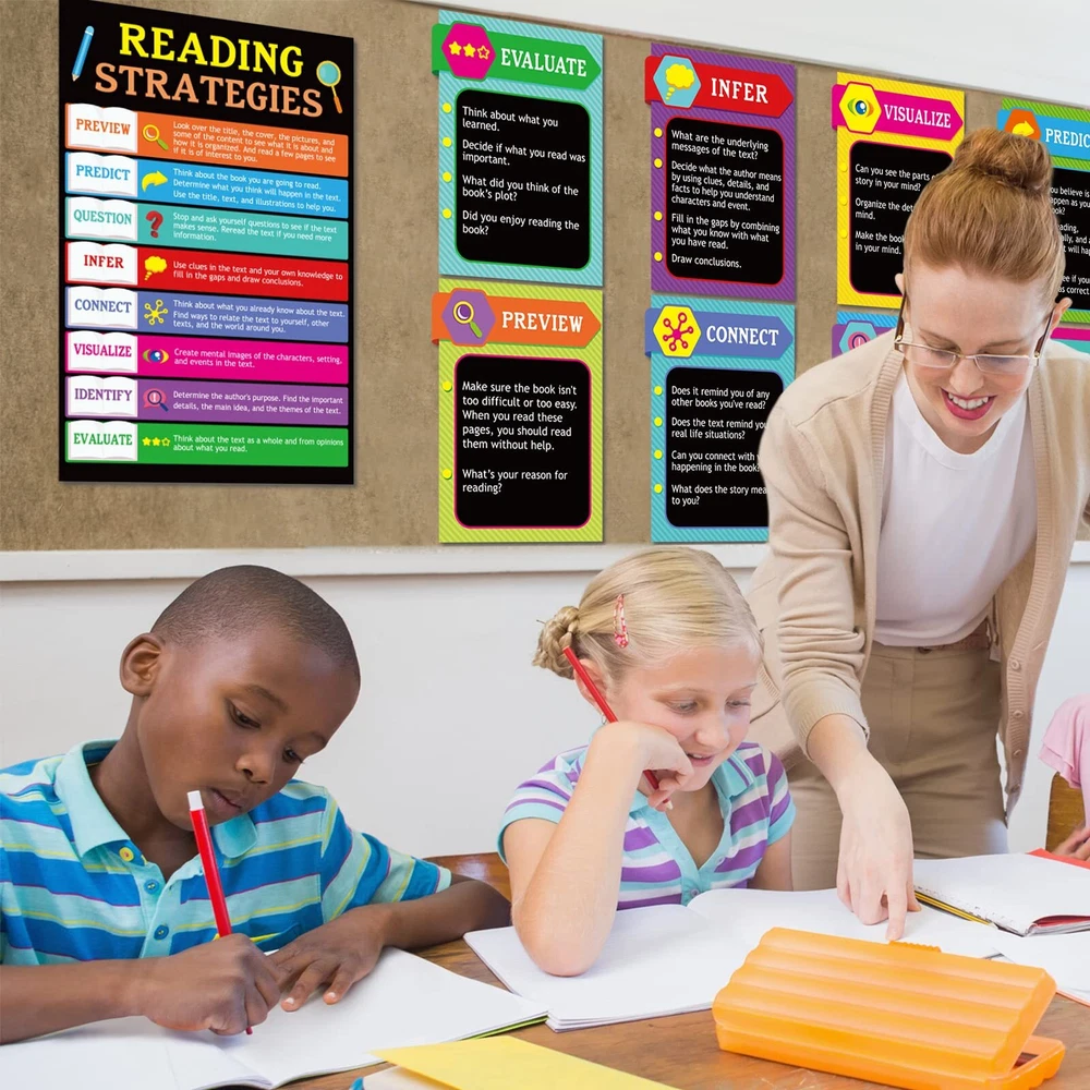 9 Pieces Reading Strategies Posters Educational Bulletin Board Set for Classroom Laminated Grammar Posters for Elementary Middle School Classroom Supplies Decorations. Package includes : 9 pieces reading strategies posters. Material: made of cardboard. Size: as the picture shown. Color: as the picture shown. Feature: Designed for preschool, elementary school and middle school grades, suitable for classroom and libraries. Made of high quality cardboard and double sided laminated with PET film, which is durable, waterproof, tear resistant and reusable. Colorful and beautifully designed with cute images that are eye-catching and easy to grab the attention of a student or child. Can be used as classroom decorations, gifts and education posters. Warm notes: Please allow slight deviation due to manual measurement. Please allow slight color difference due to different monitors. Includes 9 double-sided laminated reading strategy posters designed for elementary and middle school classrooms Durable and reusable PET film lamination makes posters waterproof and tear resistant Colorful designs with explanations and examples grab students' attention and help them learn Perfect for decorating classrooms and teaching reading comprehension, communication skills and more Can be used as gifts, decorations or educational posters in schools, offices and libraries
