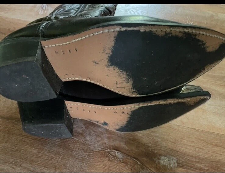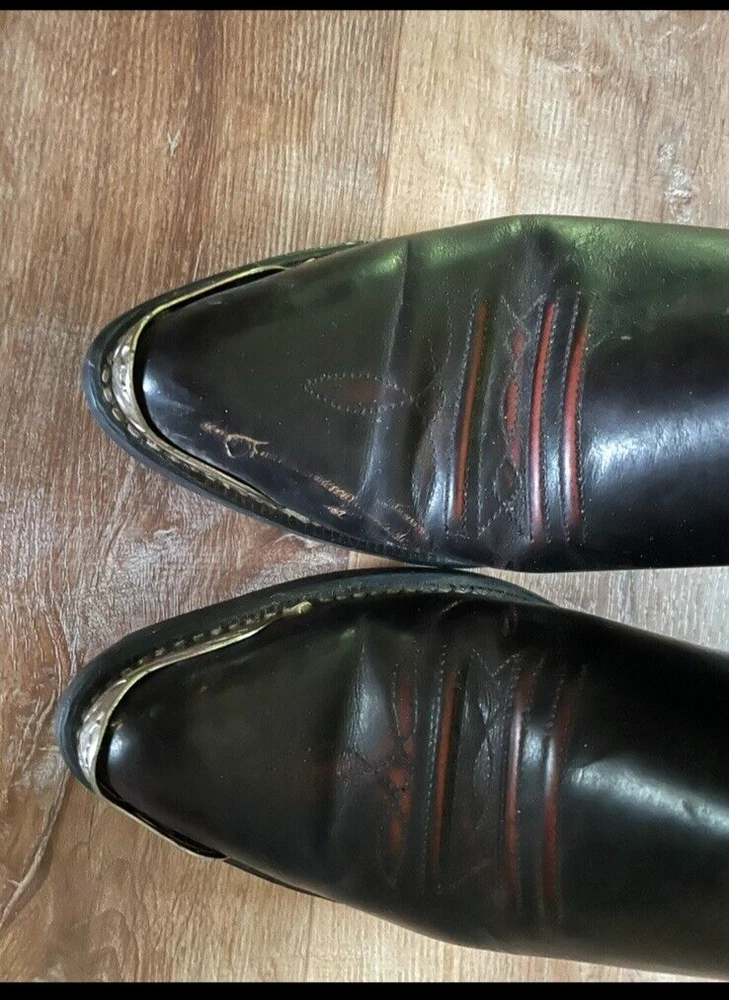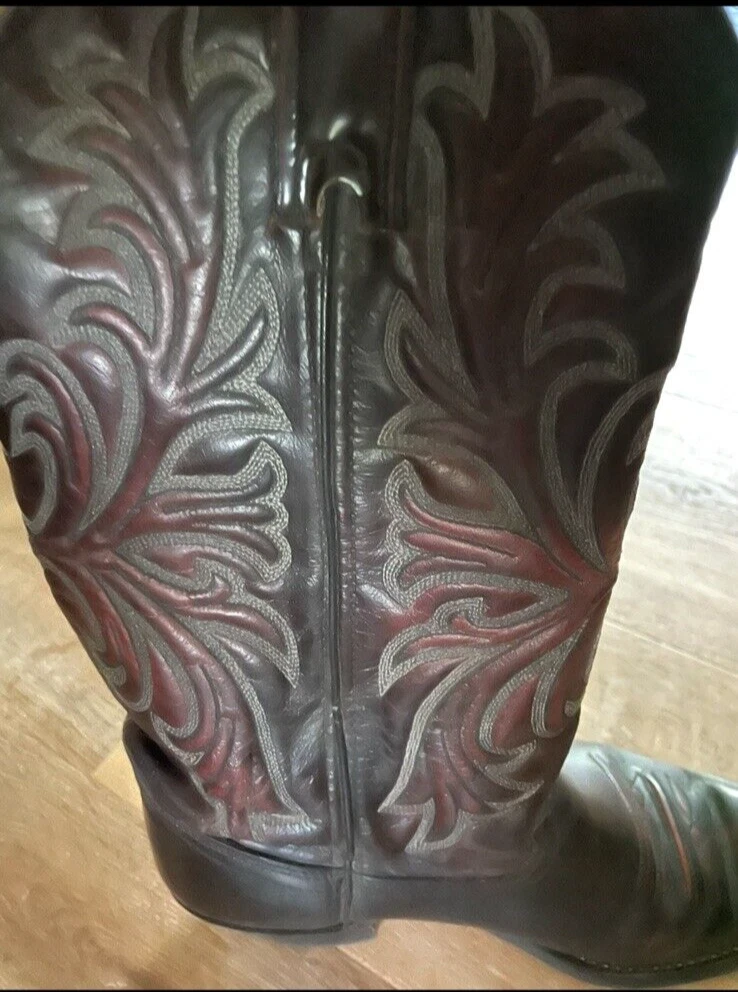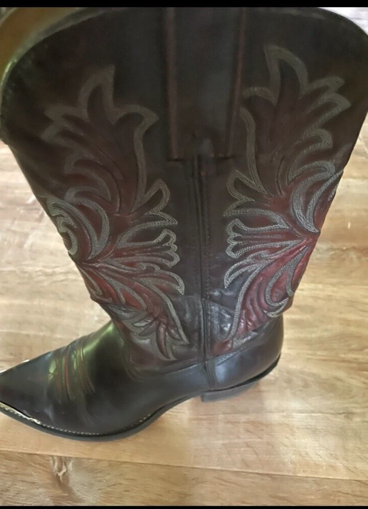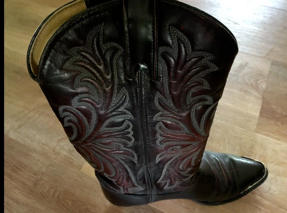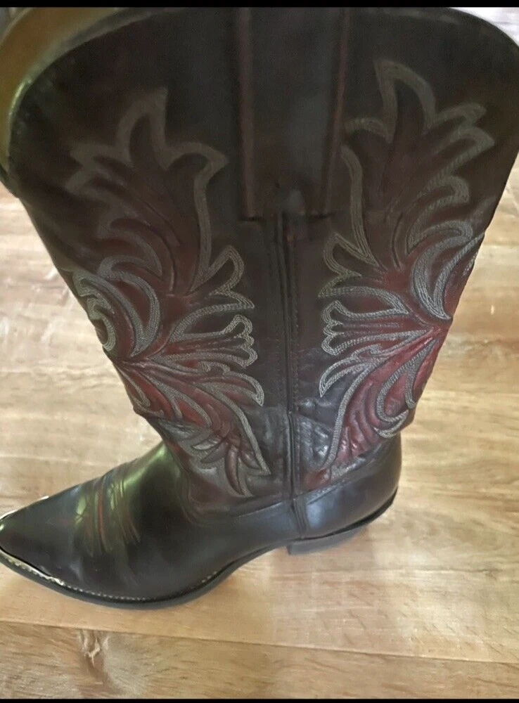 Texas Brand Dark Brown Maroon Cowboy Boots Size 9D Men's with silver tips that are in good condition. Texas brand size 9D has a couple scratches on the right boot toe area--see pictures