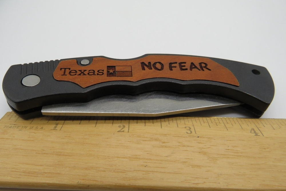 Texas No Fear Pocket Knife No Box Serrated Blade Clip on Thanks for Looking Please review photos closely. Message me with any questions you have.
