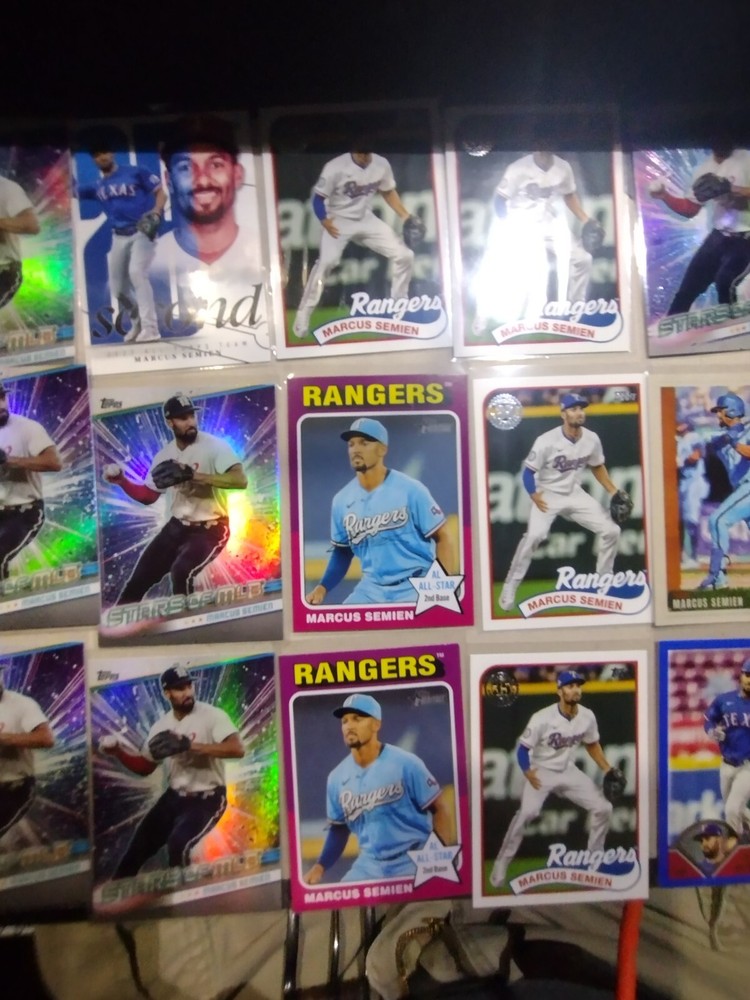 This mixed card lot features 24 trading cards of Marcus Semien, the Texas Rangers' All-star 2nd Basemen from the 2023-24 season. Manufactured by Topps in 2024, these cards are part of the Major League Baseball (MLB) collection and include various insert features. The cards showcase Semien in his Rangers uniform and are standard sized sports trading cards, perfect for any baseball card collector or fan of the Texas Rangers.