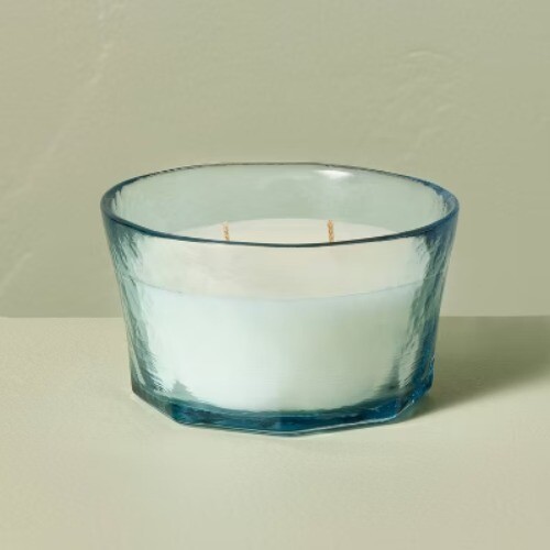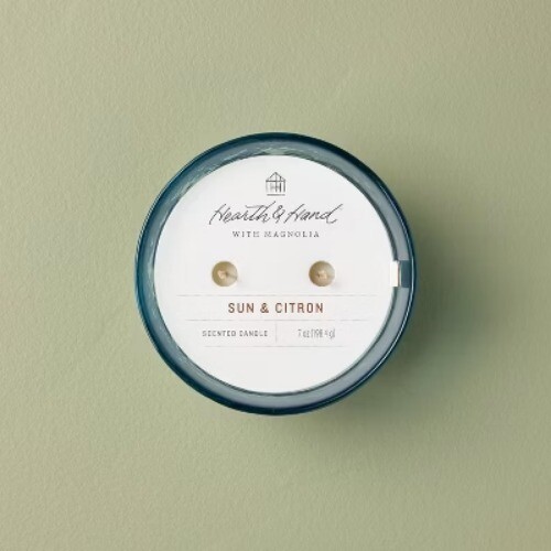 Description Awaken your senses with the beachy aroma of this Textured Glass Sun & Citron Jar Candle from Hearth & Hand™ with Magnolia. Housed in a textured glass jar, this five-wick candle's soothing sun and citron notes provide a relaxing ambiance in any room. The soy, palm and paraffin wax blend provides approximately 30 hours of burn time, making it a perfect companion for moments of relaxation or casual get-togethers. Hearth & Hand™ with Magnolia: Gather ∙ Create ∙ Enjoy highlights 5-wick textured glass jar candle Notes of sun & citron ̐ Made of soy, palm and paraffin wax Burns for around 30hrs 32oz