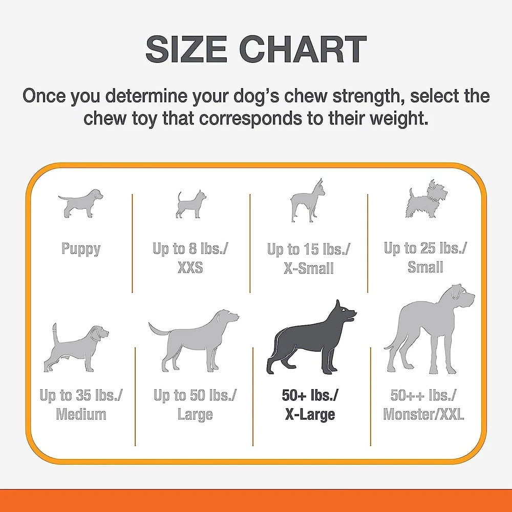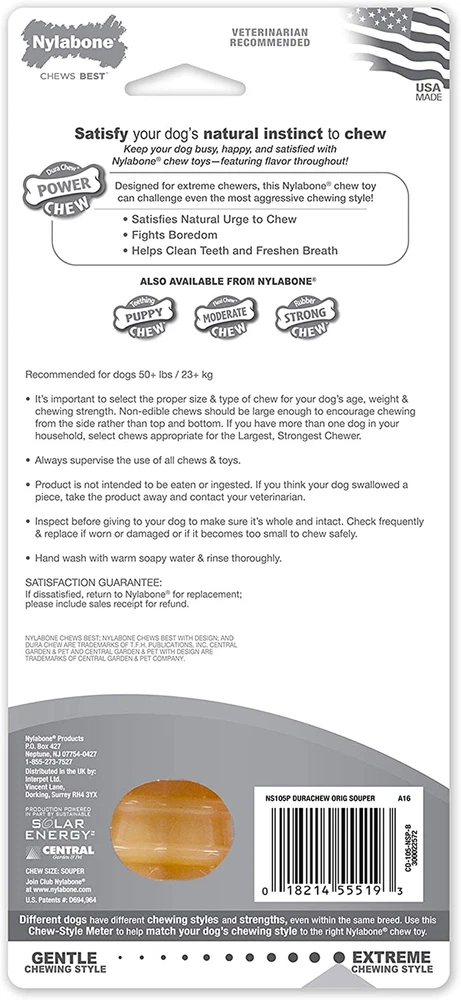 TEXTURED KNUCKLE BONE - Ridges and nubs help clean teeth and freshen breath FOR EXTREME CHEWING STYLES - This durable and strong dog toy for aggressive chewers is designed with our toughest material DOG TOY TO KEEP THEM BUSY & HAPPY - This dog toy for boredom encourages healthy, non-destructive chewing habits while safely satisfying dogs’ natural urge to chew MADE IN THE USA - This dog chew toy is proudly made in New Jersey TRUSTED CHEW TOYS WITH HEART & PURPOSE - Every chew toy’s unique shape, individual texture, and gotta-have-it flavor is created with purpose and love to give your dog what they need, when they need it! DELICIOUS ORIGINAL FLAVOR - Made with enticing flavor infused throughout FOR X-LARGE DOGS - Over 50 pounds CHEW TOY DIMENSIONS - Measures 7.75" long x 2.25" wide x 1" high ABOUT POWER CHEW TOYS Made from our toughest nylon material, Power Chew toys challenge even the most extreme chewing styles! These durable dog chew toys for aggressive chewers come in many different shapes and enticing flavors to discourage destructive chewing, help clean teeth, and simply keep dogs happy! TEETH-CLEANING TEXTURES, IRRESISTIBLE FLAVOR! Indulge your dog’s natural chewing instinct with the Power Chew Textured Knuckle Bone! One of our most popular shapes, this tough chew toy for dogs features ridges and nubs that help reduce plaque and tartar as they chew. It’s a heavy duty dog toy designed with tough nylon for long-lasting fun and includes enticing flavor infused throughout that dogs simply can’t resist. Made with heart and purpose, this veterinarian-recommended heavy chewer dog toy is a must-have for every large-breed powerful chewer! NYLABONE CHEWS BEST What your dog chews matters! With destructive behavior among the leading reasons dogs are returned to shelters, we know healthy habits can make a life-changing difference. For 70 years, our family-founded brand continues to safely satisfy dogs’ chewing instincts and help them stay in loving forever homes! GUARANTEED YOUR DOG WILL LOVE IT Before we introduce new dog products to furry friends and pet parents everywhere, we make sure our very own dogs love them first! If you’re not happy with your Nylabone chew toy for any reason, simply return it to us with the sales receipt for your money back. Or, reach out to our Consumer Care team so we can help make it right (and talk about how much we also love our dogs).