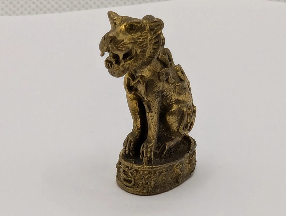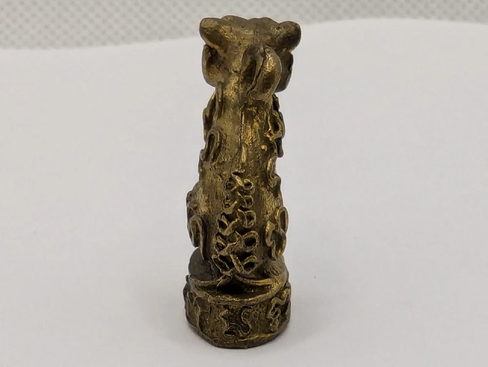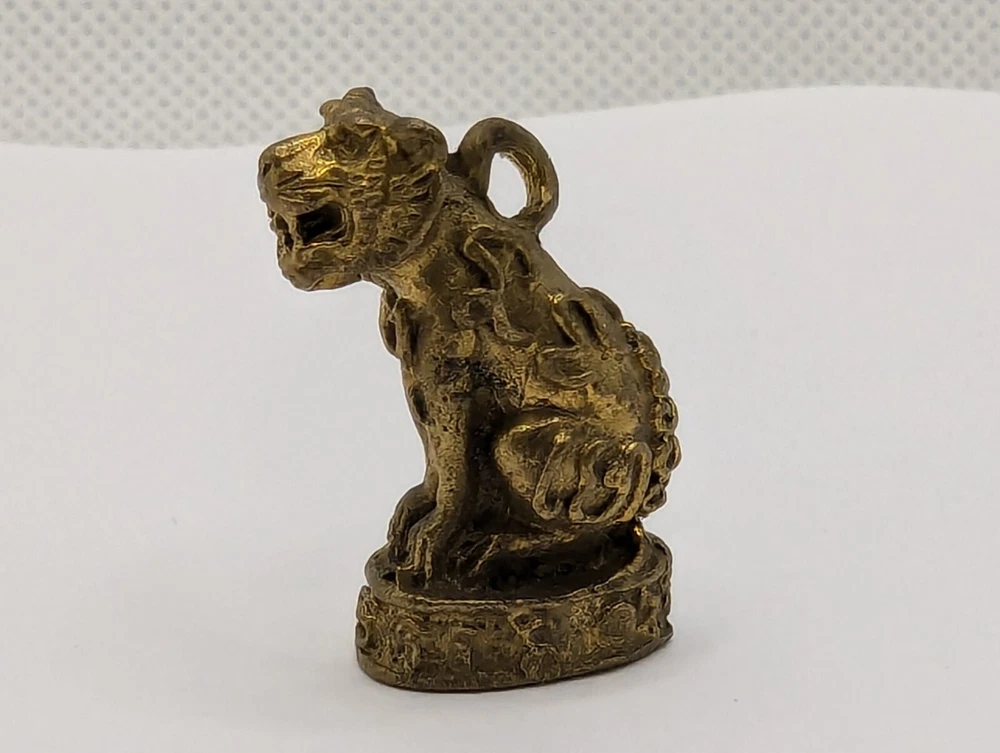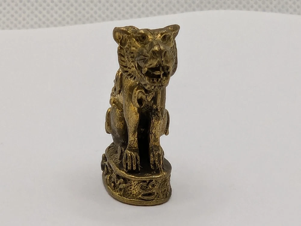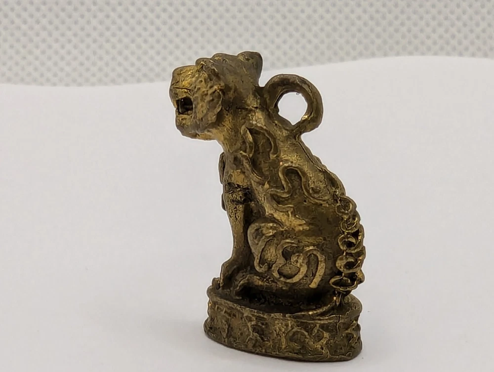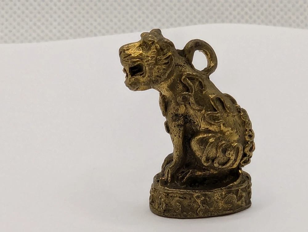 Thai Sitting Tiger Amulet Talisman Mini Metal Pendant Statue Figurine. Approximately 1 Inch Tall. It has a loop on the back of the neck for hanging, the loop leans a little to one side. Very good condition. Please check out the photos to see the item in detail.