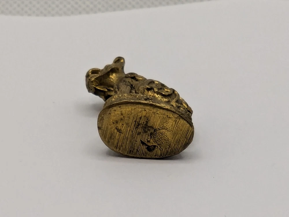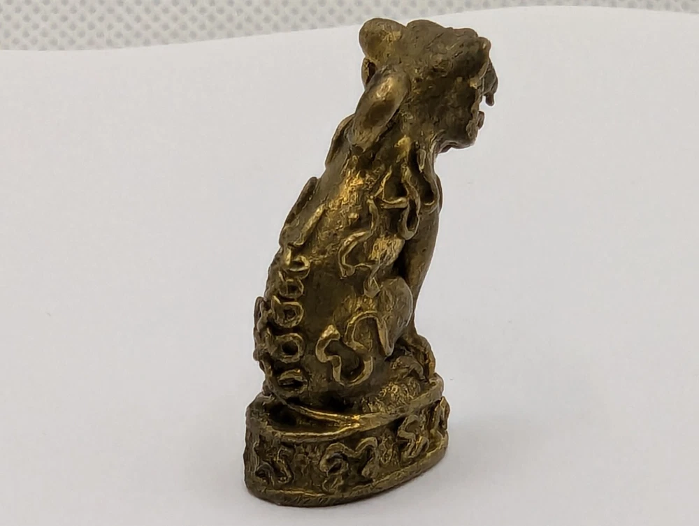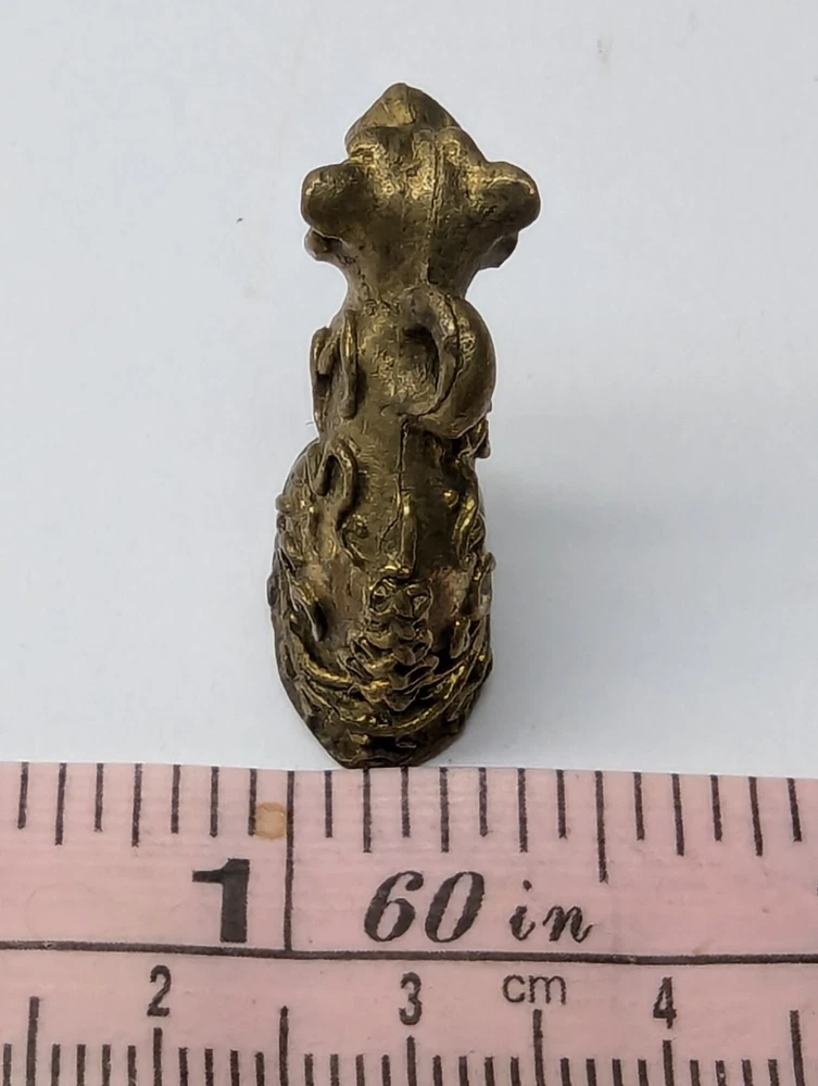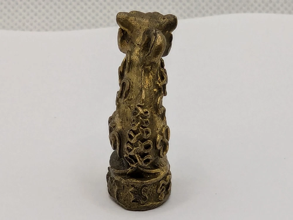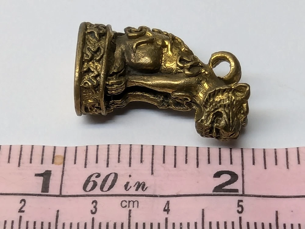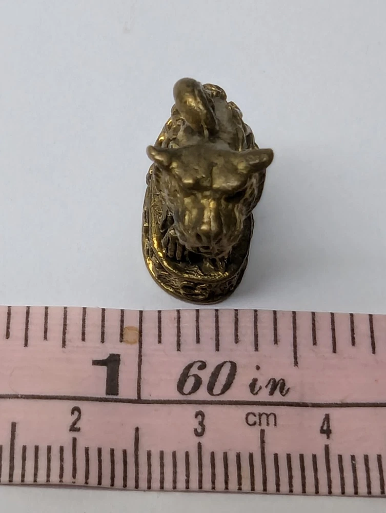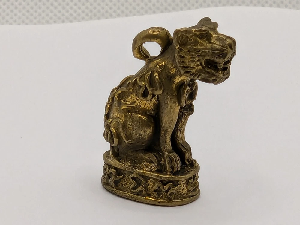 Thai Sitting Tiger Amulet Talisman Mini Metal Pendant Statue Figurine. Approximately 1 Inch Tall. It has a loop on the back of the neck for hanging, the loop leans a little to one side. Very good condition. Please check out the photos to see the item in detail.