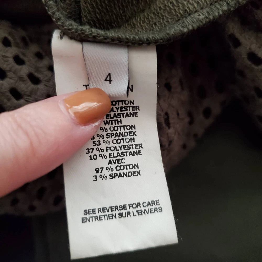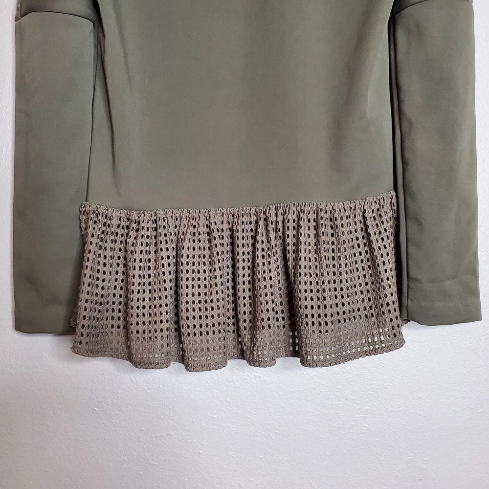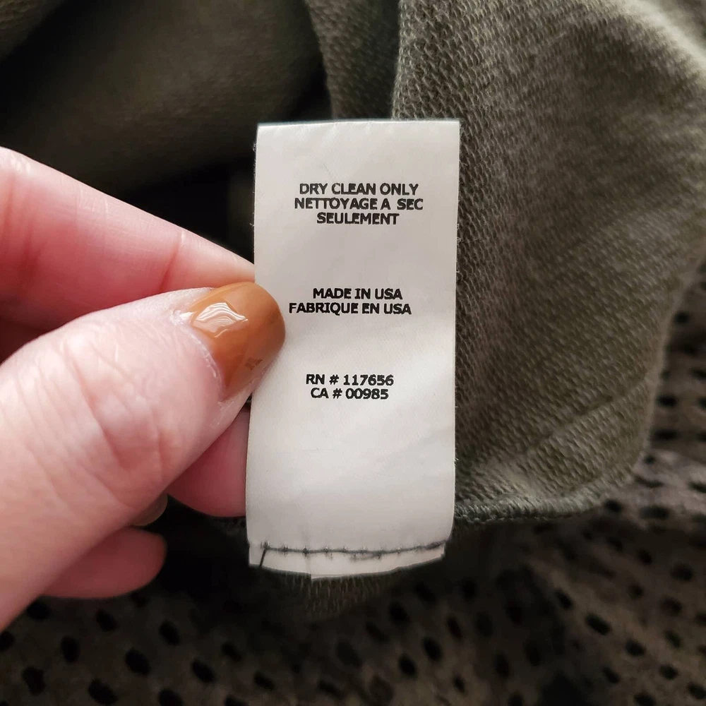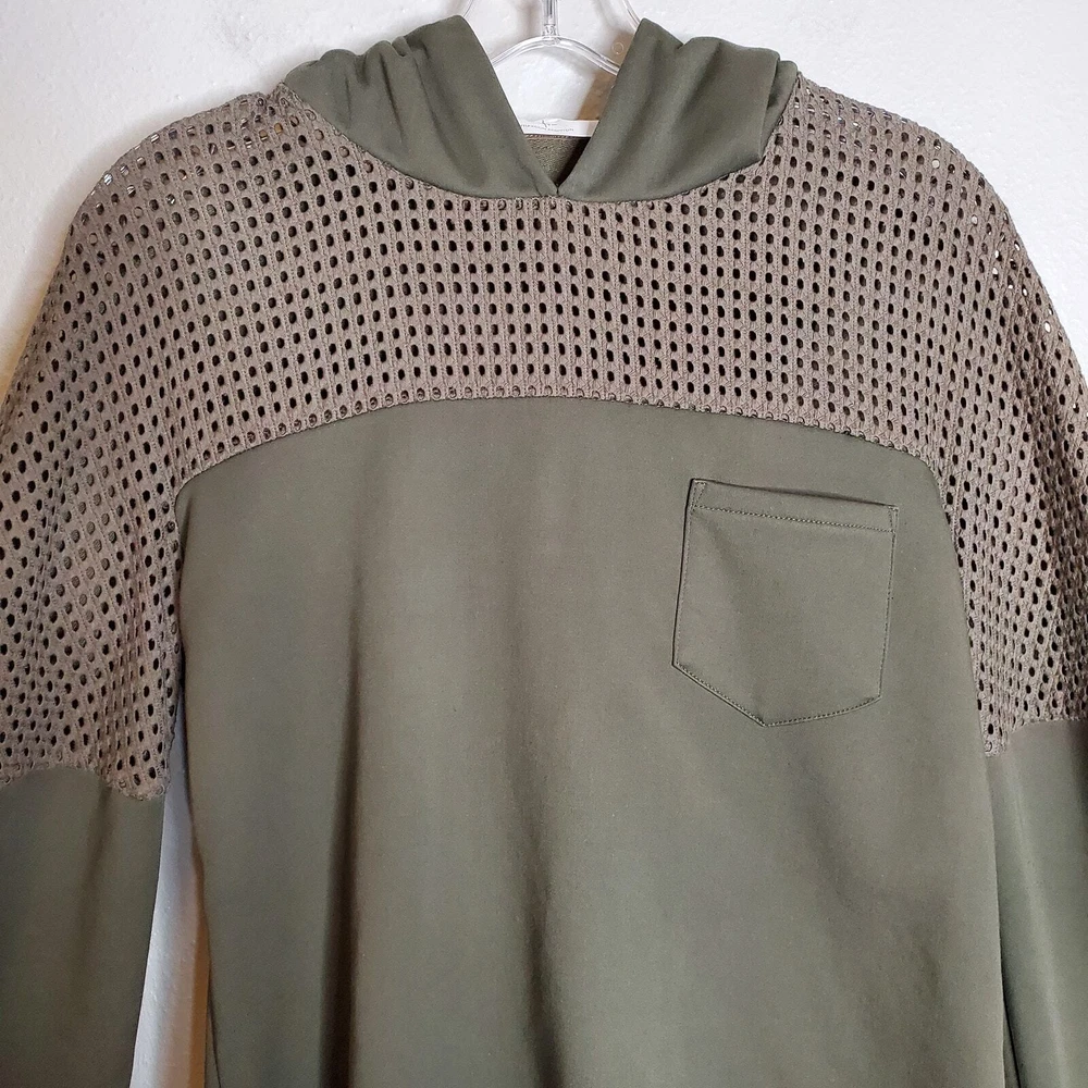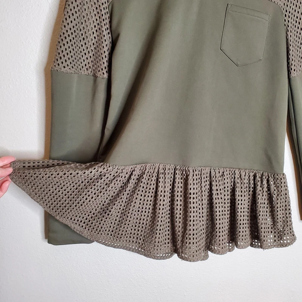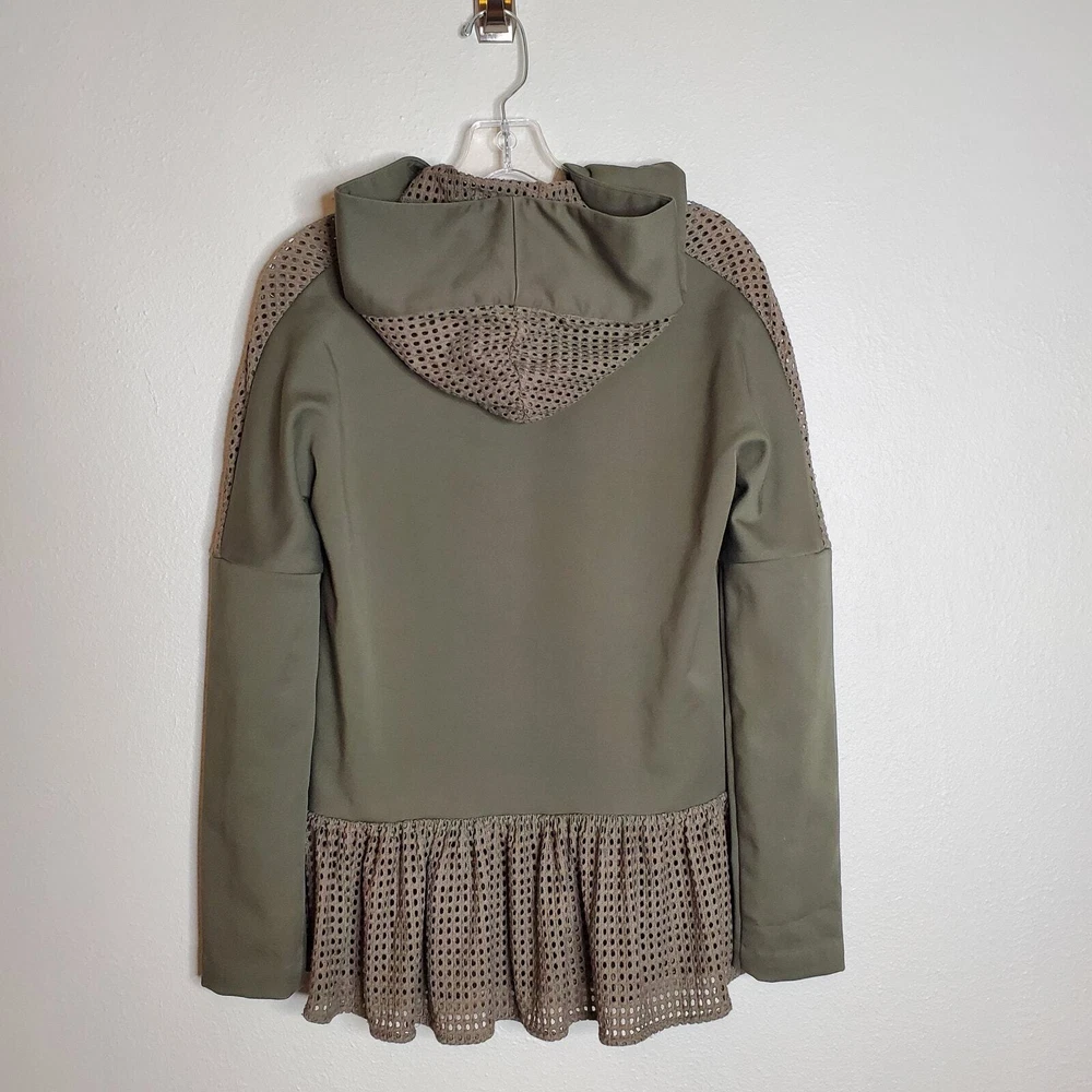 Excellent preowned condition / No flaws. Olive green color Thick stretch knit fabric Long sleeves Hooded 1 chest pocket Peplum / ruffle hem Vented mesh / eyelet panels Fabric content/care instructions in photos Approximate measurements: 18" Armpit to armpit 27" Length Style tags: Solid, Warm, Casual, Athleisure, Contrasting Trim, Neutral, Army Green, Basic, Minimalist, Olive Green, Lounge, Relaxed, Fall Fashion Ships next business day! Please message me with any questions. 438-230302 TSW2
