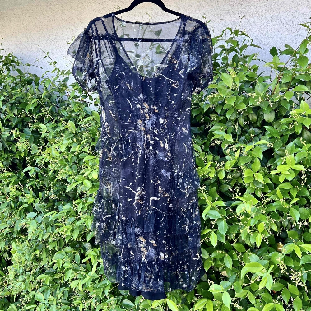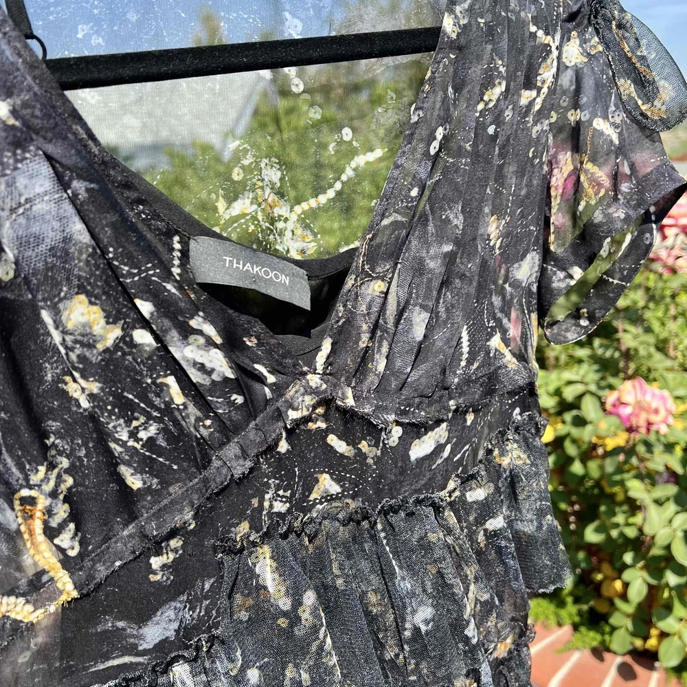 Thakoon Silk Ruffle Dress in Sheer Black Floral Mesh, Women’s Size 4 or Small, may fit medium Condition: New Without Tags, never worn, no flaws. MSRP $990 Details: Mini / just above the knee length Tiered with ruffle hem Feminine flowy short sleeves Floral print in yellow, grey and white Mesh sheer overlay V-neck, hidden side zipper Self & Slip: 100% Silk Combo: 100% Nylon Approximate measurements: 31” Bust, 15.5” Across (17” with stretch), 36” - 37” Long 3” Shoulders, 7.5” Sleeves Tags: Silk, Ruffles, Sheer, Tiered, Luxury, Designer, Party, Formal, Cocktail, Graduation, Wedding Guest, Revolve, Fairy, Coquette