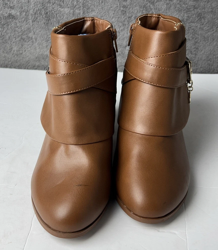 These Thalia Sodi ankle boots are designed for women in a size 8.5 with a stylish camel color and a wedge heel height of 2 inches. The boots feature zip sides for easy wear, straps for added detail, and a round toe shape. They are suitable for various occasions such as travel, parties, casual outings, workwear, or business settings. Additionally, the equestrian and cowgirl themes add a unique touch to the overall design, making them a versatile and fashionable choice for different seasons.