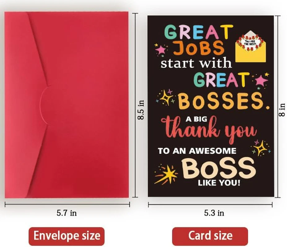 Store New Arrivals Add to Favorite View Feedback Contact Thank You Card Gifts for Boss Leader Manager, Cute Bosses Day Card Gifts for Her Him, Funny Boss'S Day Card Gifts for Men Women, Best Boss Appreciation Card Description Number of Items 1 Color ZY165 Manufacturer Part Number ZY-165-BH Item Weight 0.95 ounces Package Dimensions 8.47 x 5.71 x 0.16 inches Unique Gift: You can give this as a gift to your boss, friends, or leader at any time and place. It's such a great gift to express love. Boss's Day Card: When your boss or colleagues and even teachers receives this card, she may be very excited. When she opens the card,she will smile happily. Premium Quality: Cards are printed on recycled 300gsm linen cardstock for a luxury feel. Package Include: The 8 x 5.3inches / 20.5 x 13.5cm greeting card sturdy red matching envelope. Blank Inside: leaving plenty of room for your personal message, show your love to the special one. Product Description Product Display Policy on Product Sourcing and Fulfillment Dear Valued Customers, We would like to clarify an important aspect of our business operations to ensure transparency and trust in our relationship with you. Product Fulfillment: Fulfillment by Amazon (FBA): The products are stored in Amazon Fulfillment Centers. This storage solution ensures that the inventory is kept in a secure and climate-controlled environment, which helps maintain the quality and safety of the products. Efficient Delivery: Utilizing Amazon's fulfillment services allows us to leverage their robust logistics network to provide you with fast and reliable shipping. This means you receive your purchases in a timely manner with the added assurance of Amazon's trusted delivery systems. Customer Assurance: Quality Control: Every product is carefully selected and undergoes rigorous quality checks before being listed for sale. Our commitment is to provide you with high-quality items that meet your expectations. Secure Storage: Amazon's Fulfillment Centers are renowned for their high standards of security and efficiency. Your products are stored safely until they are shipped to you. Customer Support: Should you have any questions or concerns regarding your purchase, our customer support team is readily available to assist you. We are dedicated to ensuring your satisfaction with every transaction. We appreciate your business and are committed to providing you with a seamless and satisfactory shopping experience. Thank you for your trust and understanding. Sincerely, -Manager- Shipping Policy and Expectations Dear Valued Customers, We are committed to ensuring that your package arrives as quickly as possible. However, we kindly ask for your understanding regarding certain factors that may occasionally affect shipping times. Our Commitment: Prompt Processing: We strive to process and dispatch your orders promptly to minimize any delays. Reliable Shipping Partners: We work with reputable shipping companies to ensure your packages are handled with care and delivered efficiently. External Factors: While we do everything within our power to expedite your order, please note that some factors are beyond our control: Weather Conditions: Severe weather can impact shipping routes and cause delays. High Postal Traffic: During peak seasons, such as holidays, the increased volume of packages can lead to longer delivery times. Shipping Company Performance: The performance and schedules of shipping companies may vary, potentially affecting delivery times. We appreciate your patience and understanding in these situations. Rest assured, we are doing everything possible to get your package to you as soon as possible. Customer Support: If you have any questions or concerns about your order, please do not hesitate to contact us. Our customer support team is here to assist you and provide any necessary updates on your shipment. Thank you for your trust and continued business. Shipping Policy and Customer Satisfaction Shipping Information: Service Area: We offer shipping to the lower 47 states. Please confirm with us about the delivery date before completing your purchase. Thank you. Address Requirements: We do not accept P.O. Boxes. Please provide a physical address for delivery. Shipping Restrictions: Unfortunately, we are unable to ship items to the state of Ohio and California due to shipping agreements and restrictions. International Shipping: eBay International Shipping Hub: For shipping outside of the continental USA, we only use eBay's International Shipping Hub. The item is shipped to Illinois and then sent to the rest of the world. Duties and Taxes: International customers are responsible for all duties and taxes. Please continue to check out to calculate the shipping costs for your country. Inquiries: Messages regarding eBay's International Shipping Program must be directed to eBay exclusively. Customer Satisfaction: We try our very best to ensure every customer is completely satisfied. If there's a problem, please message us! We're happy to help. If you are happy with your purchase, we would really appreciate your positive feedback. Once positive feedback is left, our system will automatically leave positive feedback in return. Thank you for your business and for helping us maintain a positive and trustworthy marketplace. Return and Exchange Policy Dear Valued Customers, We strive to ensure that you are satisfied with your purchase. However, we would like to clarify our policy on returns and exchanges. No Returns Policy: No Returns: We do not accept returns. Please make your purchase carefully and review all product details before completing your order. Damaged or Non-Functional Items: Replacement or Exchange: If your item arrives damaged or not functional, we will be happy to replace or exchange it. Please contact us immediately with details of the issue, and we will assist you in resolving the matter promptly. Contact Information: If you have any questions or concerns regarding your purchas