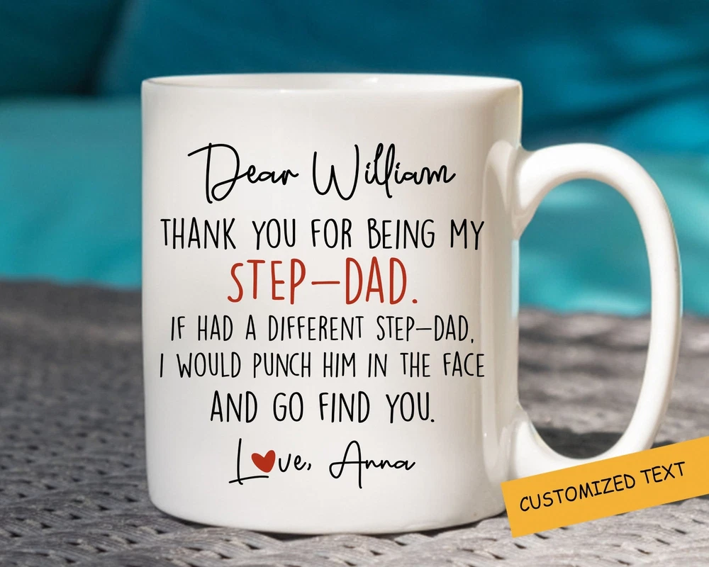 Thank You For Being My Step Dad Personalized Mug Fathers Day Gift Idea Birthday Product Details.. This high quality 11oz. ceramic white mug has a premium hard coat that provides crisp and vibrant color reproduction sure to last for years. Perfect for all hot & cold beverages. The highest quality printing possible is used. It will never fade no matter how many times you wash it. Material: 100% Ceramic. Print both sides. Dishwasher and Microwave Safe. High Gloss + Premium White Finish. Printed in the U.S.A. Personalized & Custom. We support personalized and custom mug to add custom, when placing an order, you can add notes to the "order note" in shipping address section. Also you can contact us directly via message. Shipping Info. Ready to ship in 1 to 2 business days, All products are made-to-order and proudly printed in the United States. Shipped by USPS and DHL, You will receive your order in 5-7 days. Replace & Refund. All products are defective during shipping broken, chipped will be replaced free of charge. You are not satisfied with the product, we will refund 100% money to you. If any other issues arise, please do not hesitate to message, we would be more than happy to assist you.