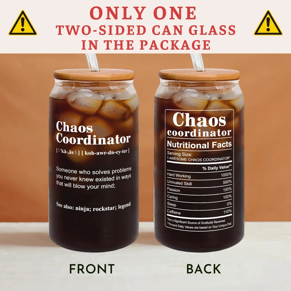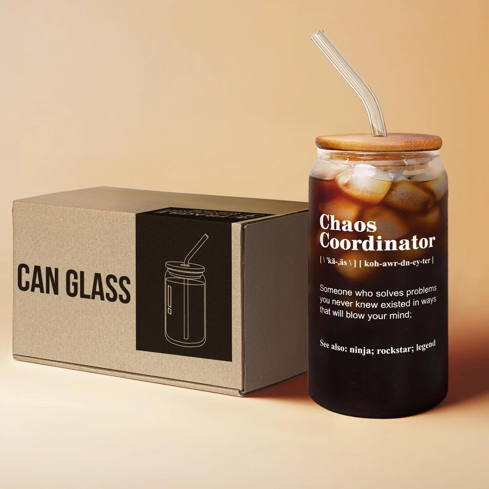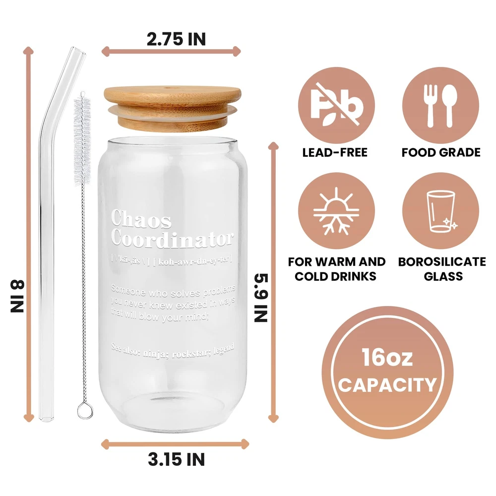 CHAOS COORDINATOR GIFTS FOR WOMEN: The Chaos Coordinator Tumbler Can Glass is a must-have for anyone looking to add a bit of cuteness and humor to their work desk. Suitable for coworker gifts for women, boss gifts for women, boss lady gifts for women, gifts for boss women, assistant gifts, supervisor gifts for women, manager gifts for women, gifts for secretaries, office gifts for coworkers, gifts for female coworkers, office gifts for women, teacher gifts for women, funny gifts for women ... THANK YOU GIFTS FOR WOMEN: Every time she uses this Chaos Coordinator Cup, she will be reminded of all the special moments you two have shared together. Ideal for thank you gifts for coworkers, appreciation gifts for coworkers, coworker appreciation gifts, teacher appreciation gifts, boss appreciation gifts, boss birthday gifts for women, coworker christmas gifts, white elephant gifts, white elephant gift ideas, boss christmas gifts ... EXCELLENT QUALITY MATERIAL: Our Supervisor Chaos Cup Can Glass is made from 100% high-density borosilicate, which is a premium material that is completely safe for use. It does not contain any lead, toxins, BPA, BPS, phthalates or cadmium. Whether you prefer warm or cold beverages, our glass bottles are suitable for both and don't transfer the flavor of your drinks. You can easily and comfortably grasp it in your hand thanks to its exquisite cylindrical design. PACKAGE INCLUDES: This Boss Lady Cup Set Package includes 1 x 16 Oz Can Glass, 1 x Leak-proof Bamboo Lid, 2 x Reusable Glass Straws, and 1 x Cleaning Straw Brush. The straw brush helps you clean the inside of the drinking straw well. In addition, the lid helps protect against spills, guaranteed to keep your drink safe and secure. We recommend hand washing to preserve the design of the glass tumbler. PORTABLE & MULTIFUNCTION: With its sleek and modern design, our Boss Cup/Teacher Cup Can Glass is sure to add a touch of elegance to any setting like homes, kitchens, cafes, and bars... The compact dimensions of 3.15" W x 5.9" H make it highly portable, allowing you to take it with you wherever you go. You can use it to enjoy a wide range of beverages, including cocktails, tea, morning coffee, smoothies, soda, and beer...