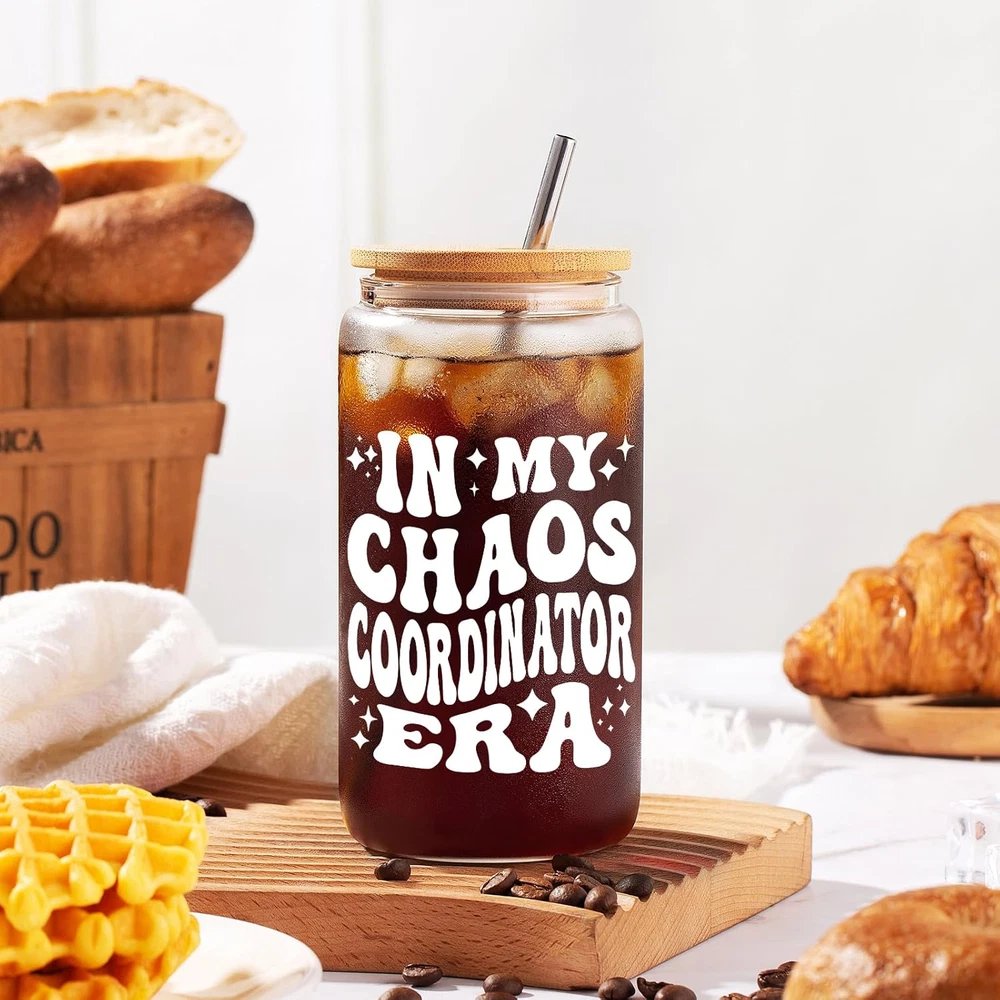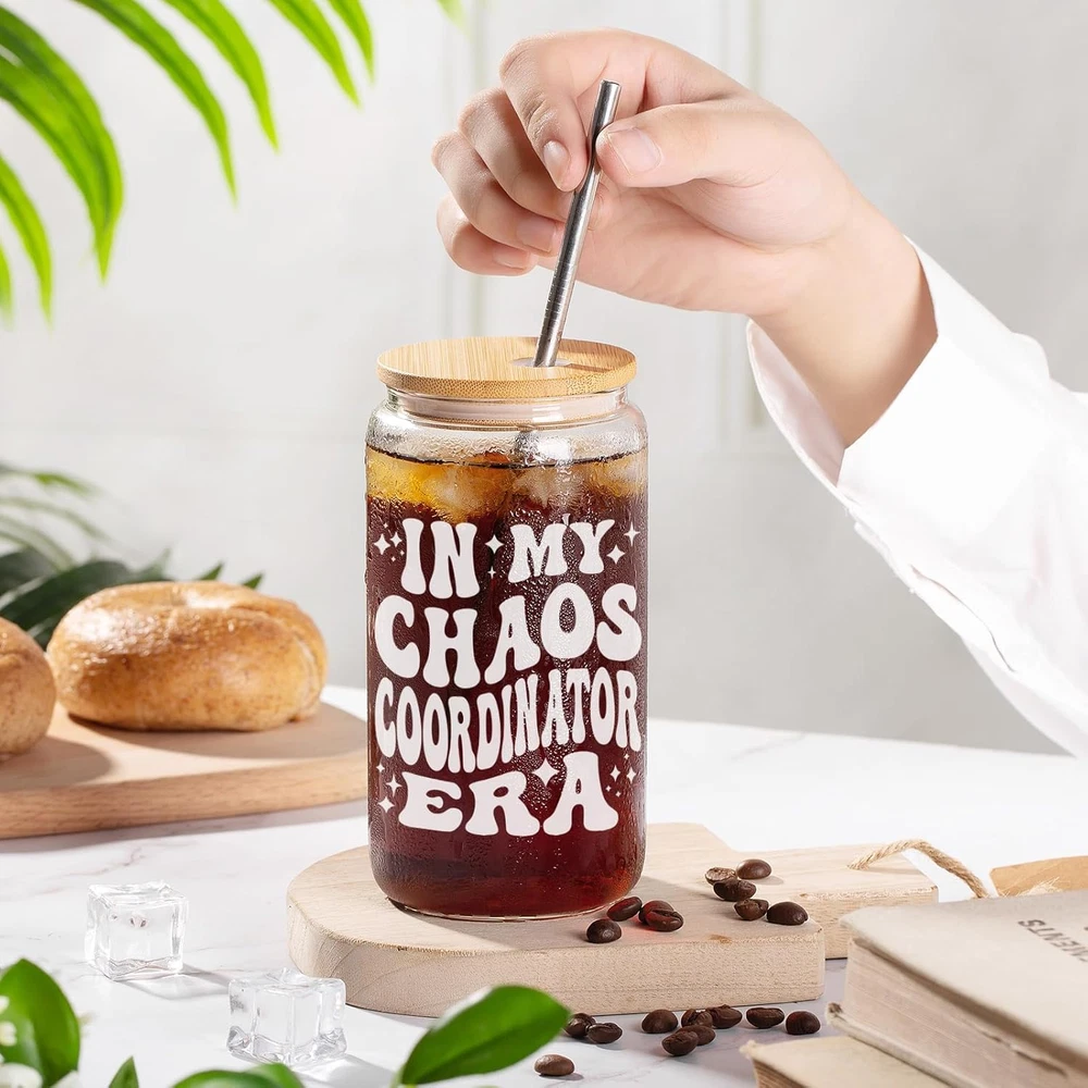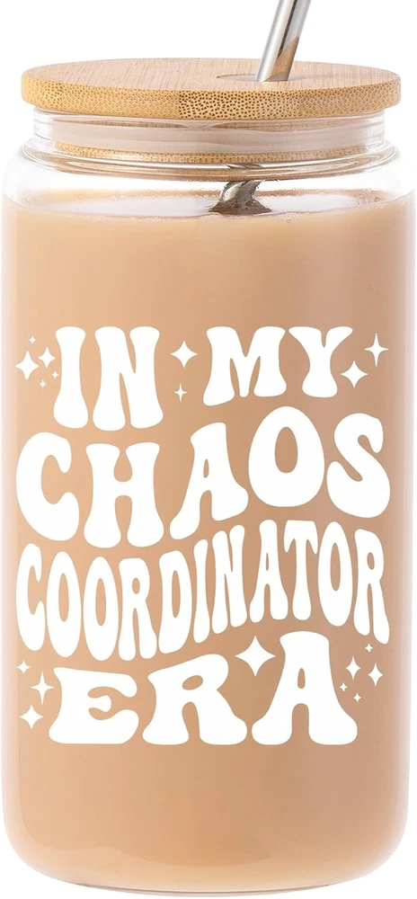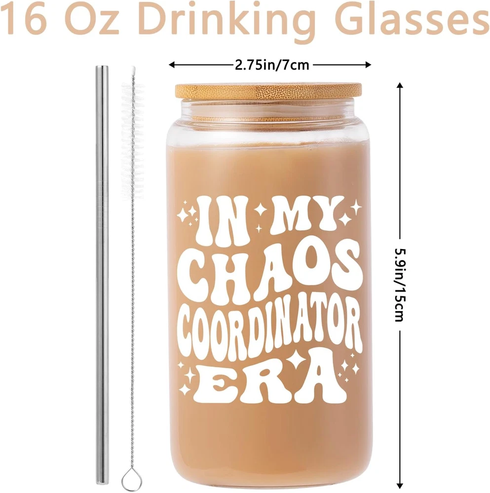 Chaos Coordinator Gifts for Women: This 16 OZ iced coffe cup is a simple and exquisite design, use it to show the appreciation for their help and dedication, the best gift for maintaining various interpersonal relationships; appreciation gift for teacher / leader/ boss/ social worker/ colleague/ employee/ work bestie /manager/ best friends/ mom/ dad/ staff/ secretary Thank You Gifts For Women On Any Occasion: Put a smile on her face with our cool gifts. Suitable for coworker birthday gifts, farewell going away gift, goodbye gift, secretary day gifts, boss day gifts for boss lady, administrative professional day gifts, mothers day gifts for mom, teacher appreciation gifts, Thanksgiving Day, Christmas, stocking stuffer ... 16oz Glass Cup With Lid and Straw: Made of premium thick glass, ensures durability and long-lasting use, BPA-free materials, 16oz big capacity holds many types of drinks without affecting its natural taste. The high-quality printing ensures that the design remains eye-catching and won't fade or peel easily. Every time she uses this mug, she will be reminded of all the special moments you two have shared together Unique Christmas Gifts : Easy to bring with and use it indoor or outdoor. Great replacement for single used cups. You can use it to make iced coffee, morning coffee, latte, soda, cocktails, margaritas, beers, cola, bubble milk tea, smoothies, juices and water, you can also make your own beverages with this glass coffee tumbler with lid and straw. Ideal for cold beverages Durable Gift Box: Package includes 1 x drinking cup, 1* bamboo lid, 1* reusable stainless steel straw, 1* straw brush. Well packaged by sponge mats. With no additional wrapping required. Printing with saying “ In My Chaos Coordinator Era ” means the one who always solves problems you never knew existed in ways. Add humor to her tedious work life. Product Description