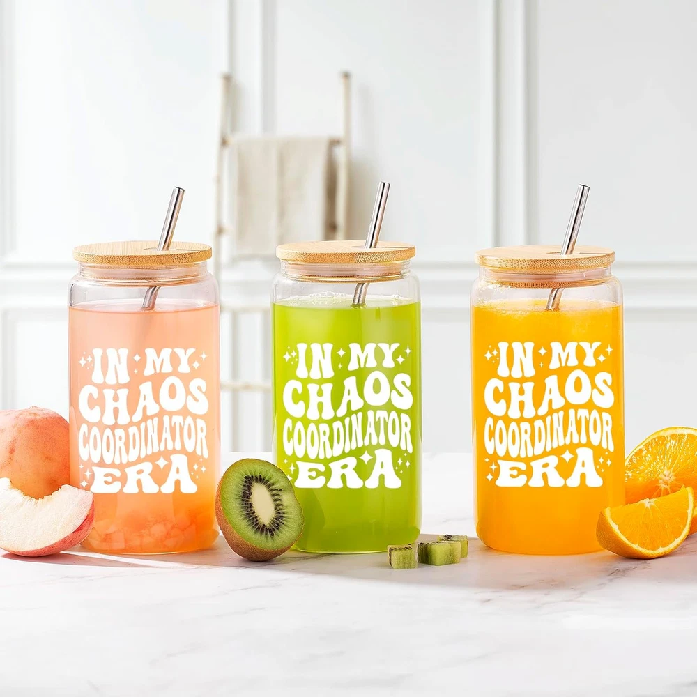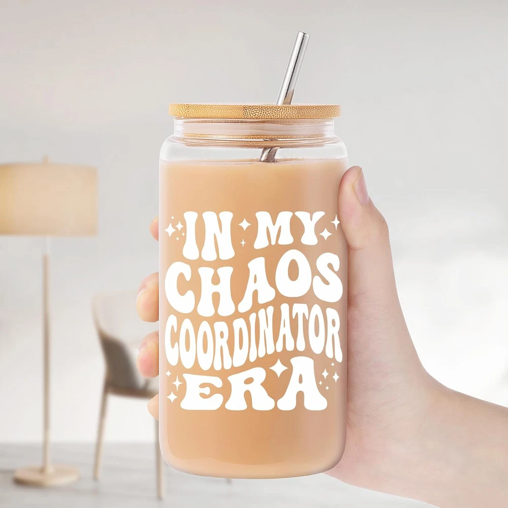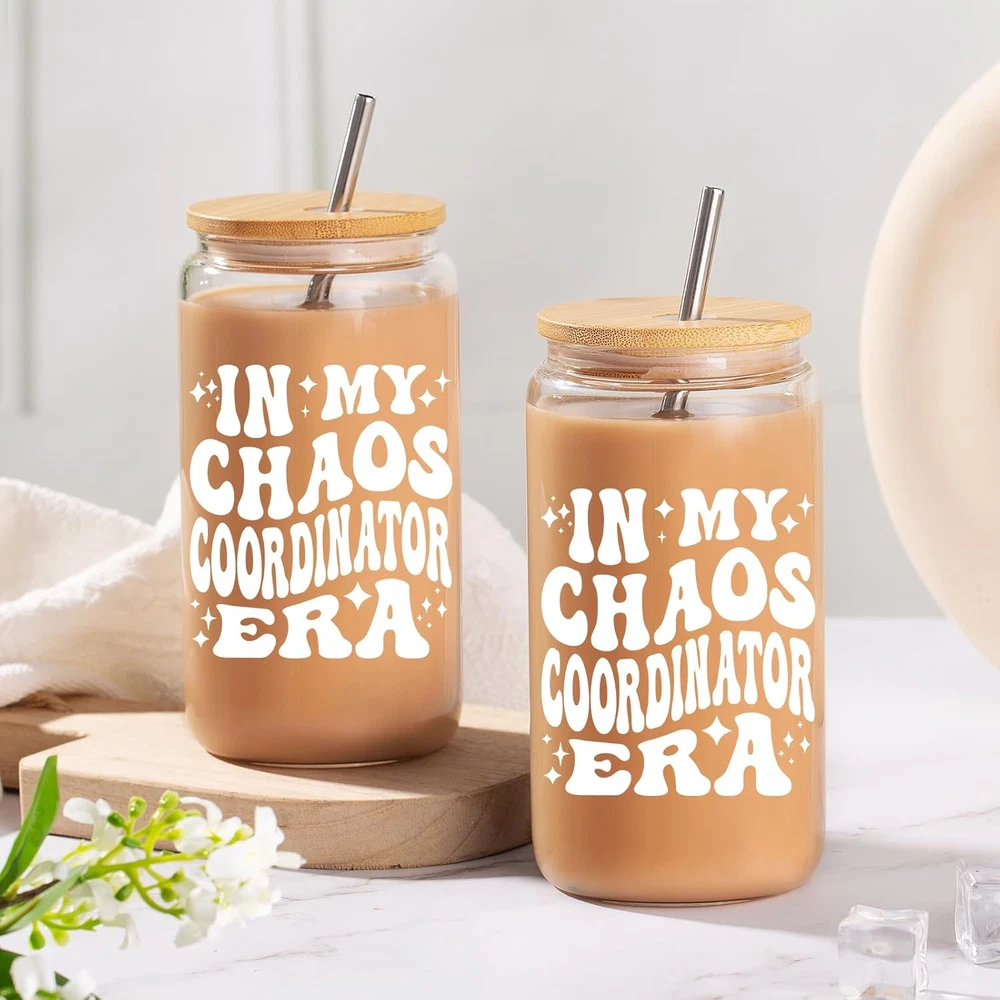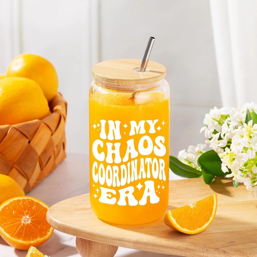 Chaos Coordinator Gifts for Women: This 16 OZ iced coffe cup is a simple and exquisite design, use it to show the appreciation for their help and dedication, the best gift for maintaining various interpersonal relationships; appreciation gift for teacher / leader/ boss/ social worker/ colleague/ employee/ work bestie /manager/ best friends/ mom/ dad/ staff/ secretary Thank You Gifts For Women On Any Occasion: Put a smile on her face with our cool gifts. Suitable for coworker birthday gifts, farewell going away gift, goodbye gift, secretary day gifts, boss day gifts for boss lady, administrative professional day gifts, mothers day gifts for mom, teacher appreciation gifts, Thanksgiving Day, Christmas, stocking stuffer ... 16oz Glass Cup With Lid and Straw: Made of premium thick glass, ensures durability and long-lasting use, BPA-free materials, 16oz big capacity holds many types of drinks without affecting its natural taste. The high-quality printing ensures that the design remains eye-catching and won't fade or peel easily. Every time she uses this mug, she will be reminded of all the special moments you two have shared together Unique Christmas Gifts : Easy to bring with and use it indoor or outdoor. Great replacement for single used cups. You can use it to make iced coffee, morning coffee, latte, soda, cocktails, margaritas, beers, cola, bubble milk tea, smoothies, juices and water, you can also make your own beverages with this glass coffee tumbler with lid and straw. Ideal for cold beverages Durable Gift Box: Package includes 1 x drinking cup, 1* bamboo lid, 1* reusable stainless steel straw, 1* straw brush. Well packaged by sponge mats. With no additional wrapping required. Printing with saying “ In My Chaos Coordinator Era ” means the one who always solves problems you never knew existed in ways. Add humor to her tedious work life. Product Description