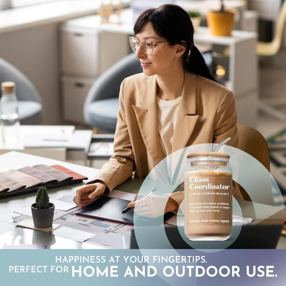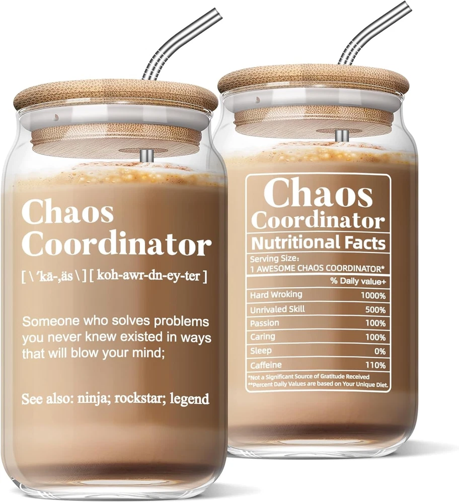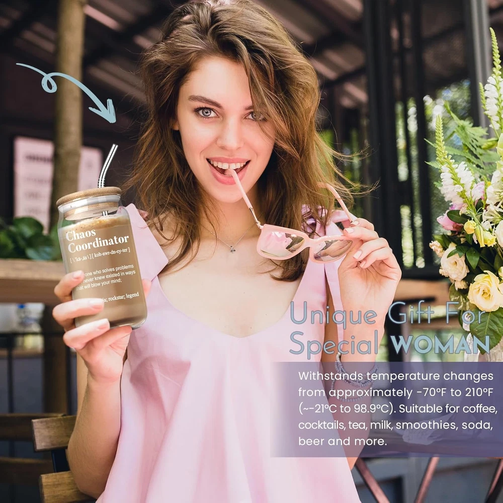 Chaos Coordinator Gifts for Women - Unique gifts for women, mom, teacher, nurse, employee, boss, manager, associates, coach, social worker, nurse, mentors, friends, assistants, secretaries. The fun pattern makes this glass perfect for birthdays, Christmas Day, Valentine's Day, Mother's Day, Nurses' Day, or any occasion. Or as an office gift, promotional gift, farewell gift, going away gift, retirement gift Thank You Gifts for Women - The unique glass cup is perfect as a teacher appreciation gift, teacher gifts, gift for mom, office gifts for women, thank you gifts for coworkers, coworker gifts for women, funny office gifts, boss gifts for women, administrative professional day gifts, social worker gifts for women, friendship gifts for female friends, gifts for women who have everything Versatile for All Beverages - This coffee cup is a versatile choice for a variety of hot and cold drinks. Whether enjoying piping hot coffee in the morning, refreshing iced tea on a sunny afternoon, or cooling off with a creamy milkshake, this glass is the perfect companion. It’s also perfect for serving juice, beer, soda, ,sprite cocktails, and any holiday beverage Premium Materia - The 16 oz glass cups with lids and straws is crafted from high-quality lead-free glass, it’s free from harmful substances and can withstand high temperatures, perfect for daily use Stylish and Functional Design - This elegantly iced coffee cup is designed for unique senses of occasion, whether at the beach, yoga studio, office, afternoon tea or parties, adding a touch of sophistication and is perfect for outdoor and home use or as a gift Product Description