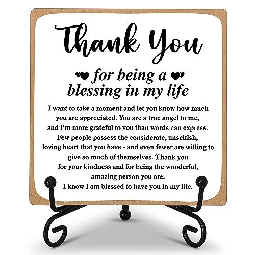 Return Policy Fast Delivery Trusted seller Thank You Gifts for Women Men Friends Mom, Thank You for Being A Blessing in My Life Wooden Plaque with Stand, Thanksgiving Day Gifts for Family Member Desk Decor - B75 Product Description Perfect Gifts for Women: This wooden sign embodies a beautiful and meaningful design, making it ideal for your friends and family. This decoration will stand proudly on any table, bringing a daily dose of positivity to their lives. Premium Quality Wooden Plaques: Crafted from high-quality wood, our tabletop signs are exceptionally sturdy. The clear print does not fade easily, ensuring a long-lasting, serviceable, and unbreakable keepsake. Appropriate size: You will receive a 1pc measuring approximately 10 x 10 x 0.5 cm / 3.94 x 3.94 x 0.2 inch home office decor. This desk sign is perfectly sized to fit your workspace. It takes up minimal space when placed next to your computer and is easily handheld. Decorative Home/Office Decor: This tabletop sign is versatile for all occasions, such as adorning coffee tables, bedside tables, desks, bookshelves, vanity, and more. Its beautiful design complements any style of home decor and ensures a daily dose of mood. Shipping Returns Payment Shipping Shipping is FREE to all addresses other than APO/PO boxes in the lower 48 states. All our stock ships from US-based warehouses. Shipped via USPS or UPS (depending on location and package weight) Unless stated otherwise, all orders will ship within 24-72 hours of your payment being processed. Check our feedback to see the great reviews of FAST shipping we offer. Returns Seller does not accept returns Payment We currently accept payment via eBay managed payments only. Once payment is cleared, we will dispatch your shipment within 1-3 business days. Please refer to the "Shipping" tab for more information regarding shipping speed to your destination.