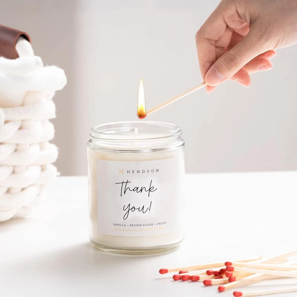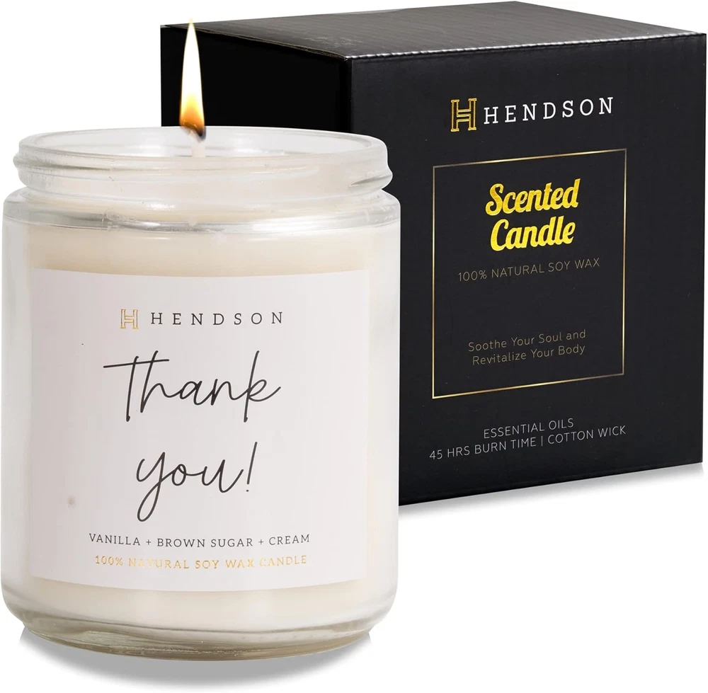 π Thank You Scented Candle: Want to thank a family member, friend, or coworker for their support? Looking for mom, dad, sister, or best friend gifts? Look no further than this glass jar candle with the deluxe gold foil accents and decorative logo. π Freshen Up The Air In Your Room: Our natural scented candles burn for up to 45 hours, filling the air with a divine aroma than helps you relax. This 100% soywax candle burns clean without producing black smoke that makes breathing hard. π Save Time On Gift Wrapping: Offer your thank you or love you gifts right away. Our fragrant candles come with a custom black gift box with gold foil accents. No need to wrap your family gifts, gifts for friends, employees, or boss gifts anymore. π Carefully Packaged Large Candle: Our friend gifts for women and men are shipped in a sturdy box with protective bubble wrapping that prevents damage during transportation. No more best friend gifts that arrive cracked, broken, or melted. π Exclusively Developed Candle Scent: With heavenly notes of Vanilla, Brown Sugar, and Cream, our fragrance candles evoke the warm atmosphere of holidays. Help your friends make the most of their birthday, anniversary, or Christmas. Product Description