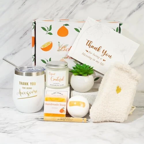 30 Days Return Policy Fast Delivery Trusted seller Thank You Gifts for Women,Employee Appreciation Gifts Baskets,Orange Fruit Themed,Thank You Gifts for Teacher Hostess Secretary Nurse Mom Pastor with Thank You Cards 9Pcs Product Description 【Gratitude Deluxe Gift Box】Occasionally, merely uttering "thanks" is insufficient. When a boss, employee, teacher, neighbor, friend, or any other individual in your life exceeds expectations and goes the extra mile for you, a "thank you" card might not seem adequate to convey your full gratitude. And this exceptional thank you gifts enables you to express your appreciation in a manner that transcends words, and she is certain to adore this thank-you present. 【Meaningful and Personal Thank You Gifts For women】A very high-quality kraft paper gift box contains a collection of 12oz coffee tumbler(featuring BPA-free double-walled vacuum insulation that maintains beverages cold for 9 hours or hot for 3 hours) | 3.5oz Lavender scented candle | Orange soap bar | Furry Sleep Socks | Milk Orange Bath Bombs | A ballpoint pen (5.43 x 0.43 in) |Faux Succulent | thank you card that says "thank you" for your personalized message. (Please see the picture for specific product introduction) 【Employee Appreciation Gifts】Employee appreciation gifts in bulk are an excellent means to express your appreciation for a job well accomplished. Surprise them with a special gift that conveys your gratitude for all the strenuous efforts they have exerted 【Express Gratitude With Ghoughtful Words】Show your appreciation with our "Thank You for Being Awesome" sign ballpoint pen and Card. This pen and the accompanying card are perfect for recognizing the dedication of your team, acknowledging a colleague/teacher/nurse's contribution, or expressing gratitude for a job well done. 【Perfect Thank You Gifts Idea】It can be utilized as employee appreciation gifts, appreciation gifts for female teachers, Teacher's Day gifts, a charming gift idea for appreciation week, the first day of school teacher gift, back-to-school gifts, graduation gifts, Thanksgiving gifts, gifts for female nurses, gifts for female bosses, hostess gifts, farewell gifts for colleagues, gratitude gifts for colleagues,welcome gifts for new employees,farewell gifts for coworkers, Mother's Day gifts, Christmas gifts, and New Year gifts Shipping Returns Payment Shipping Shipping is FREE to all addresses other than APO/PO boxes in the lower 48 states. All our stock ships from US-based warehouses. Shipped via USPS or UPS (depending on location and package weight) Unless stated otherwise, all orders will ship within 24-72 hours of your payment being processed. Check our feedback to see the great reviews of FAST shipping we offer. Returns As our valued customer, we will do our best to make sure the product you receive arrives to you on time and as expected. If you are not satisfied with your purchase, please contact us within 30 days of receiving your order to process a return. Payment We currently accept payment via eBay managed payments only. Once payment is cleared, we will dispatch your shipment within 1-3 business days. Please refer to the "Shipping" tab for more information regarding shipping speed to your destination.