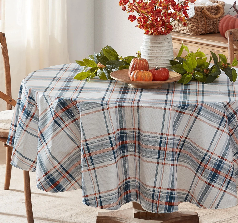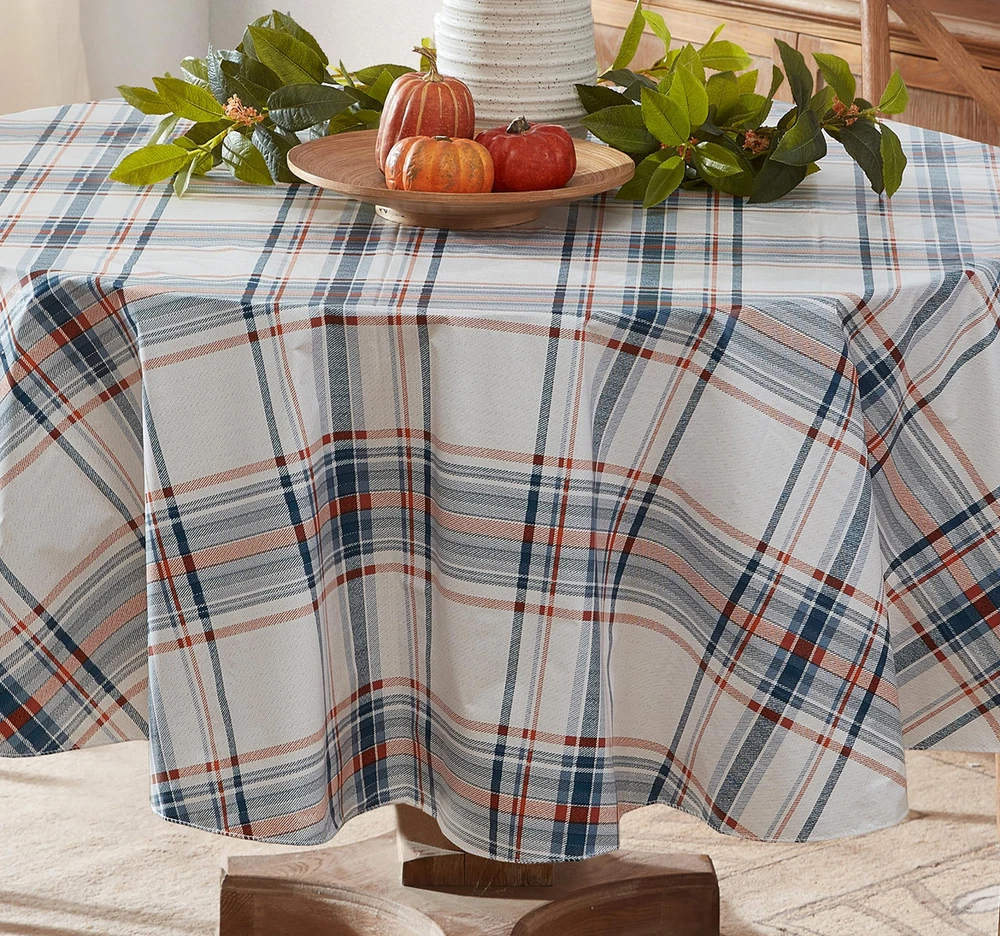 From the Harvest Farmhouse collection by . The Blue Rustic Mountain Plaid Vinyl Flannel Backed Tablecloth is perfect for and year round dining and entertaining throughout the seasons. The Blue Rustic Mountain Plaid Vinyl Flannel Backed Tablecloth is designed to be a favorite for your busy home, kitchen or dining room table or restaurant. The Blue Rustic Mountain Plaid Vinyl Flannel Backed , and Fall Tablecloth is a country rustic pattern that features a medium scale plaid in rust, stonewashed blue and rust on a white colored background. Great for use with adults and children for , Fall and at home or in commercial settings. Perfect for decorating and keeping your kitchen or dining room table protected from everyday accidents. Like plastic, the easy-care vinyl surface can be wiped clean with a damp cloth or sponge. Vinyl top layer adds a protective waterproof layer. Flannel backed to reduce skidding and slipping on most surfaces. Finished with sewn edges. Easy to fold and store when not in use. Great for indoor, outdoor, home, and commercial use alike, the Blue Rustic Mountain Plaid Vinyl Flannel Backed Tablecloth is available in a large selection of sizes and shapes for all of your holiday entertaining needs. Sizes available are: 52 x 52 Square, 52 x 70 Oblong, 60 x 84 Oblong, 60 x 84 Oval, 60 x 102 Oblong, 60 x 120 Oblong and 70 Round. Blue Rustic Mountain Plaid Vinyl Flannel Backed Tablecloth - Stonewashed Blue and Rust Country Plaid Easy Care Vinyl Tablecloth, 70” Round SIZING: 70" Round (178cm) - Fits round tables from 20 Inch x 58 Inch Diameter and Seats 4 to 6 People - Round STYLING: The Blue Rustic Mountain Plaid Vinyl Flannel Backed , and Fall Tablecloth is a country rustic pattern that features a medium scale plaid in rust, stonewashed blue and rust on a white colored background. FEATURES: Beautiful Easy Care Kitchen and Dining Room Tablecloth for Dining, Entertaining, Parties, Picnics, Restaurants and Cafeterias. Indoor and Outdoor Flannel Back Holiday Tablecloths are Easy Care - Just Wipe Clean - No Laundering Needed CARE INSTRUCTIONS:: Vinyl Flannel Backed Tablecloth - For best results use mild soap with damp cloth or sponge on vinyl surface of tablecloth. Do not Iron or machine wash or dry. Materials: Surface 100% Vinyl, Flannel Backing: 100% Polyester