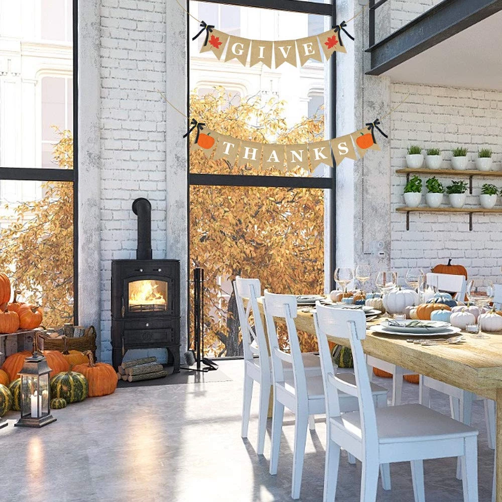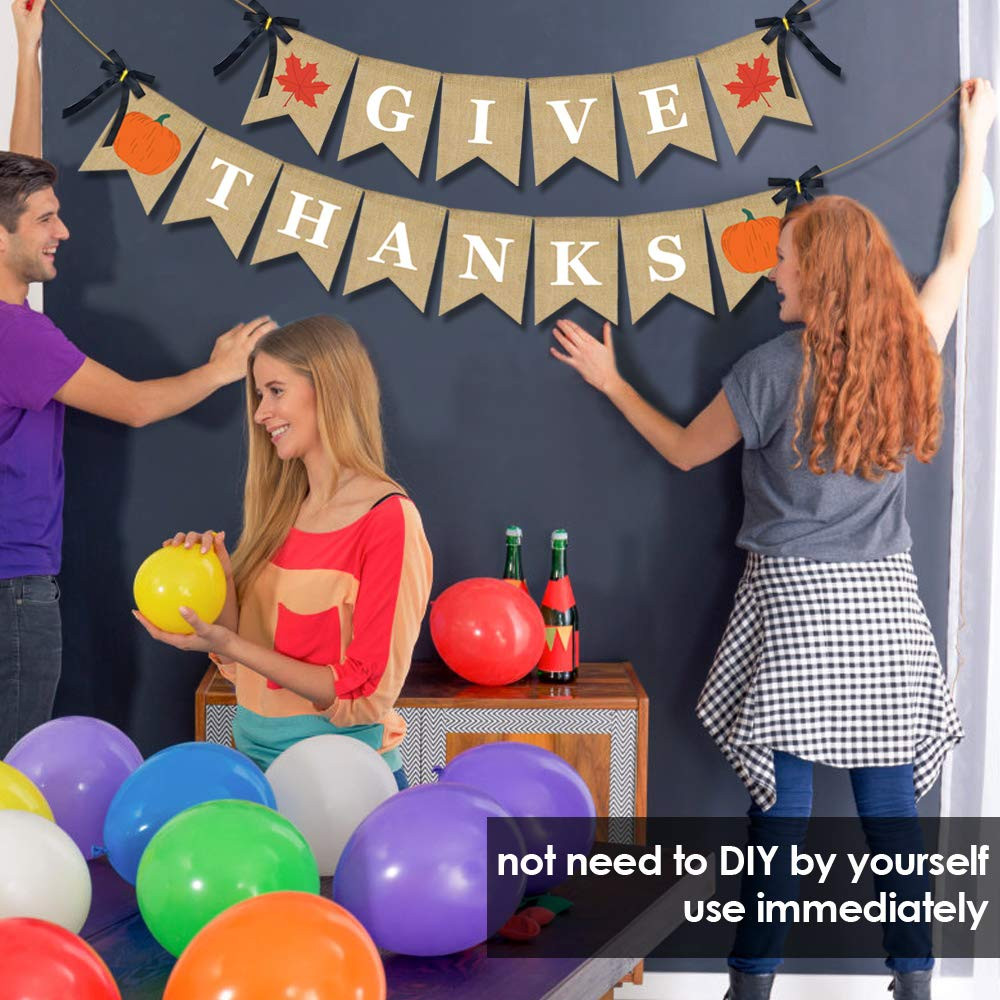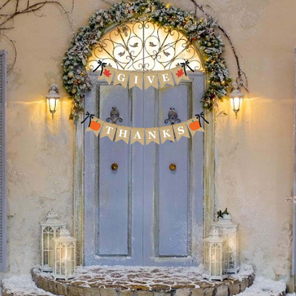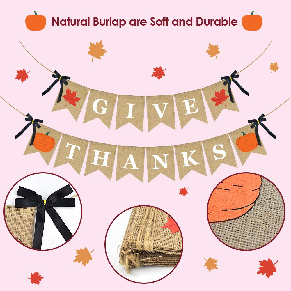 【Scope of Application】for your home mantle yard decor, thanksgiving day or fall theme party,fall festival, harvest, home, mantel, fireplace bunting garland decoration. 【Humanized Design】the banner is long enough, you can hang it any where you want. Flags can be moved or taken off easily. 【High Quality Material】natural jute burlap, durable and reusable.no bad smelling, can be used over and over. Also folds easily for storage. 【Special Design】 make banner special, the banner features 2 cute simulated maple leaves which is more beautiful than printed one.add more rustic touch for your events. 【Pre-Assembled】 The Give Thanks banner have been assembled in advance. Saving your valuable time, you can hang them directly for decoration.