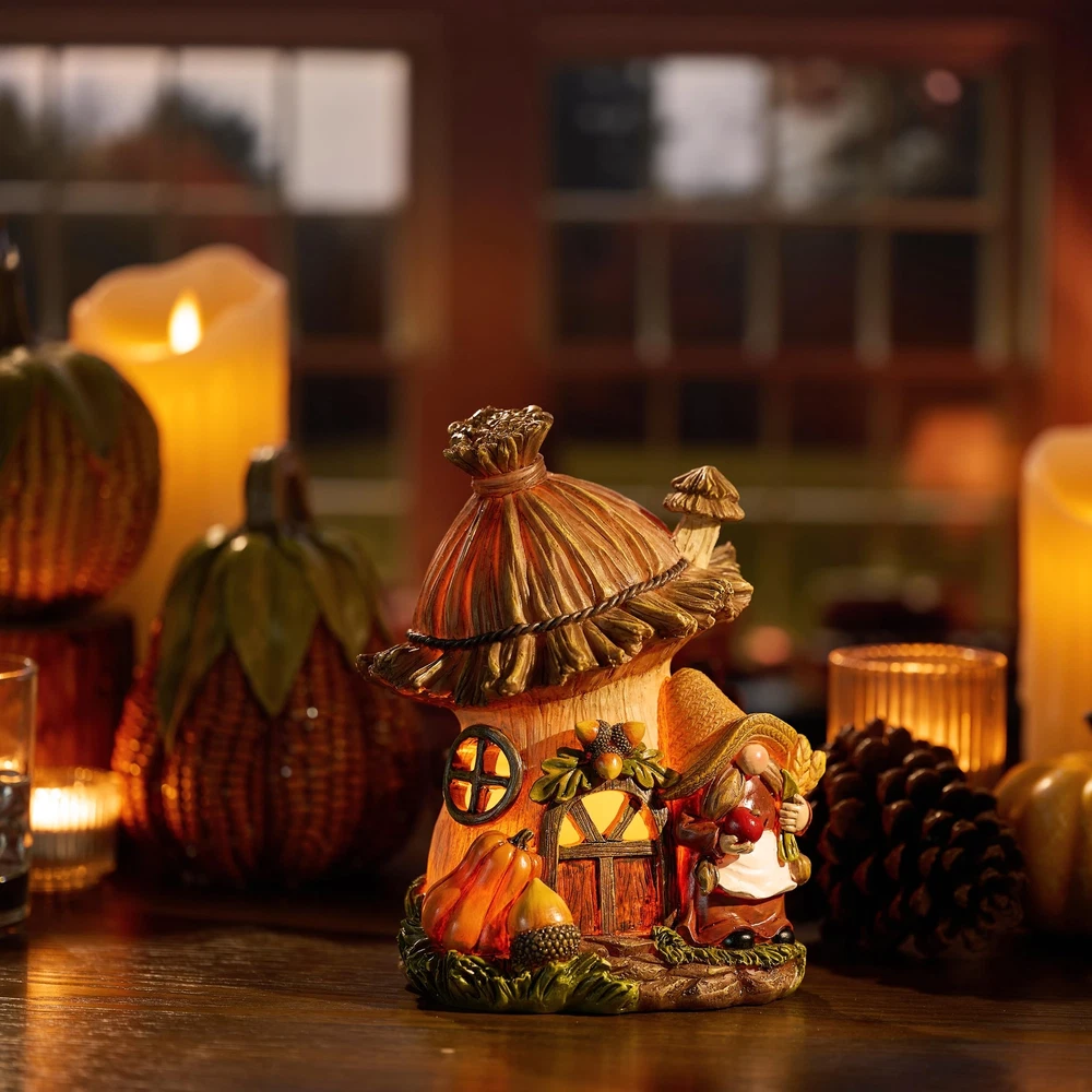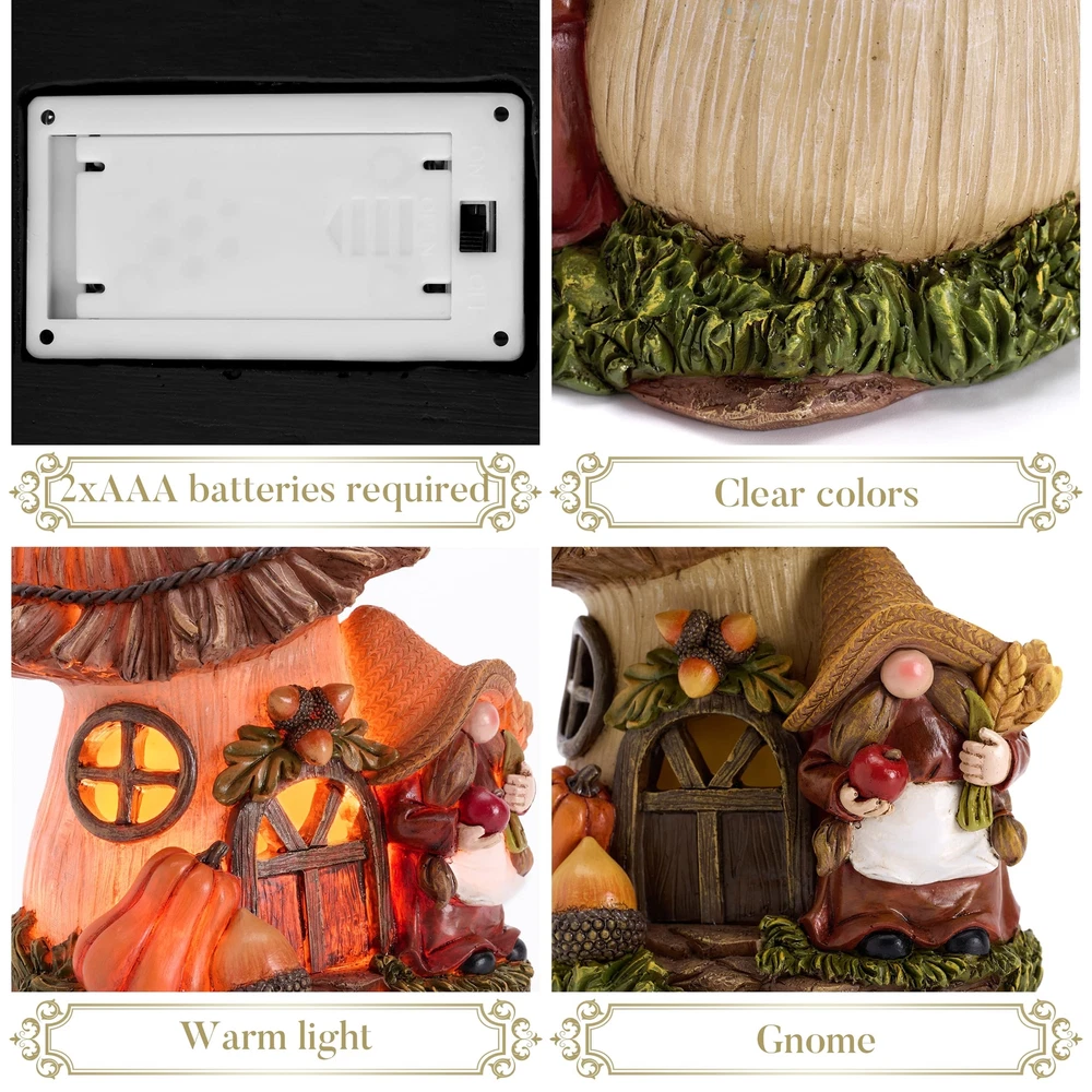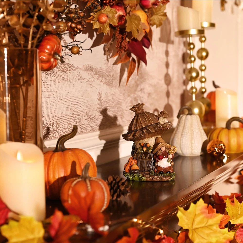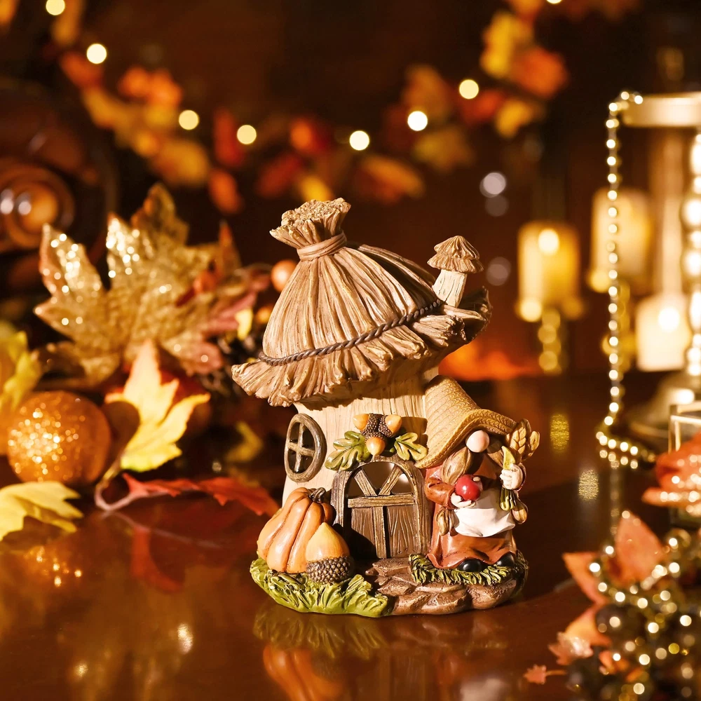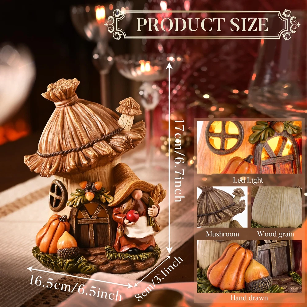 【Original Design】 is a retail brand adhering to original designs. The fall village houses is designed to look like a with a thatched roof and a gnome standing outside. The fall gnomes is holding a pumpkin and surrounded by fall items such as acorns and pumpkins. The house lights up at night, adding a warm and cozy glow to any space. 【Exquisite Craftsmanship】These exquisite gnomes decorations for home are crafted from durable resin material and each piece is meticulously hand-painted with intricate details and fine workmanship. 【Uniform Color 】 Our thanksgiving gnomes ornaments are covered with a protective coating to ensure the colors won't easily fade. With no sharp points and an anti-fading finish. Both indoors and outdoors can be used for a long time 【Multiple Application】The fall figurine for home is perfect for decorating tables, yards, window sills, gardens, shelves, desks, and more, adding a touch of fun and a sense of fall to your fall home garden. 【Charming Gift】These fall house decor are perfect as a fall gift, Thanksgiving gift, Halloween gift, birthday gift, or anniversary gift for your family, or friend, both adults and will love these lovely straw 【Figurine Size】As shown in the picture, the fall fairy house in the decoration has a size of approximately 7 inches 【Multicolor LED Lights】This fall gnome ornament with LED lighting effects creates a warm ambiance, ideal for fall.