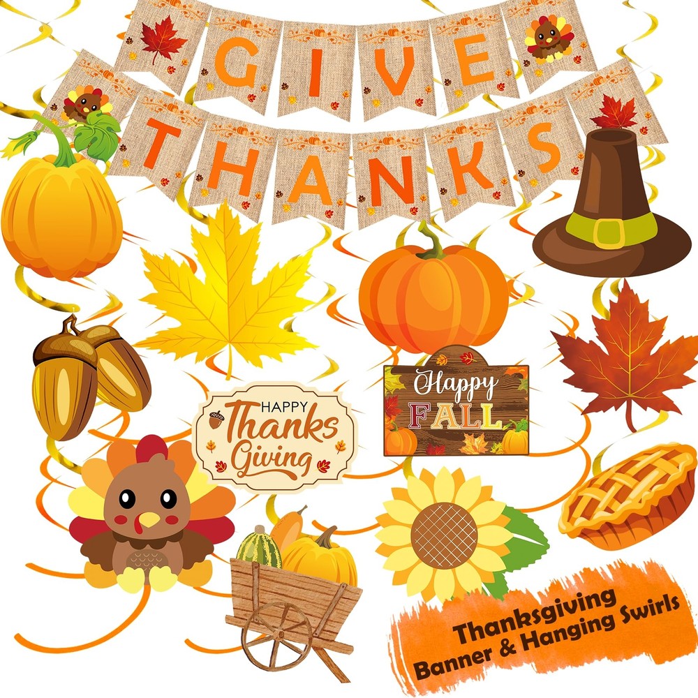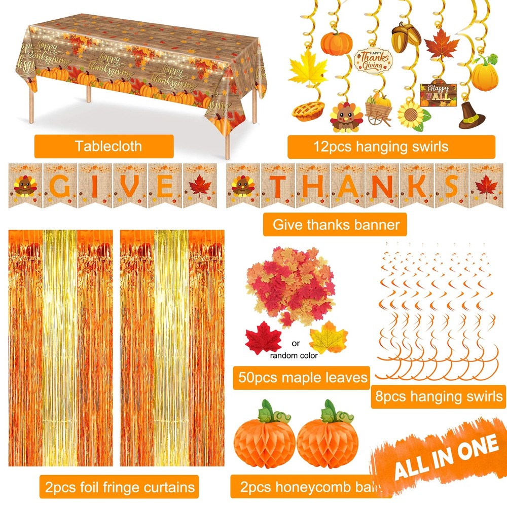 YJDFWAUT Thanksgiving Party Decorations Supplies, Thanksgiving Banner Hanging Swirls for Autumn Holiday, Turkey Autumn Hanging Decorations, Thanksgiving Foil Fringe Curtain Balloon Garland All-in-one Thanksgiving Party Decorations Set - Package Includes: Give Thanks banner, 10pcs Thanksgiving paper fan decorations, 20pcs Thanksgiving hanging swirls, 2pcs foil fringe curtains, 2pcs door porch banner, 50pcs fall maple leaves, 104pcs Wide Applications - This cute and festive decorations set suit for fireplace, office, classroom, ceiling, window, home, bars, stores. Perfect for Thanksgiving, autumn, fall, harvest themed party. The warm will attract all the attention in the room. Unique Design - This thanksgiving decoration set include 12 stunning pattern designs, such as pumpkins, turkey, corns, maple leaves, acorns, sunflower and more. Full of classic fall patterns. Buy with Confidence -Customer satisfaction is our top priority. We take pride in our quality products. Please do not hesitate to contact us if for any reason you are unhappy with our party supplies. All-in-one Thanksgiving Party Decorations Set - Package Includes: Give Thanks banner, 10pcs Thanksgiving paper fan decorations, 20pcs Thanksgiving hanging swirls, 2pcs foil fringe curtains, 2pcs door porch banner, 50pcs fall maple leaves, 104pcs Wide Applications - This cute and festive decorations set suit for fireplace, office, classroom, ceiling, window, home, bars, stores. Perfect for Thanksgiving, autumn, fall, harvest themed party. The warm will attract all the attention in the room. Unique Design - This thanksgiving decoration set include 12 stunning pattern designs, such as pumpkins, turkey, corns, maple leaves, acorns, sunflower and more. Full of classic fall patterns. Buy with Confidence -Customer satisfaction is our top priority. We take pride in our quality products. Please do not hesitate to contact us if for any reason you are unhappy with our party supplies. Shipping from the USA All of our products are shipped from the USA, ensuring quick delivery to your destination. Payment We offer the following payment methods: PayPal, credit card, bank transfer, and eBay's secure payment system. Free Shipping & Free Returns Shipping within the USA is FREE. Additionally, any return is absolutely free for you. Risk-Free Purchase You have the option to return an item within 30 days without any justification. We cover the return shipping costs! Fast Shipping We ship immediately upon receipt of payment. Generally, the package is delivered within 2-3 days in the USA. If it takes longer, we will contact you. Quality and Costs Made in Europe, USA, China No customs fees or additional charges Total satisfaction guarantee Invoice with declared VAT available upon request in .pdf format Feedback Your feedback is very important to us. After you pay for your purchase, you will automatically receive positive feedback from us.