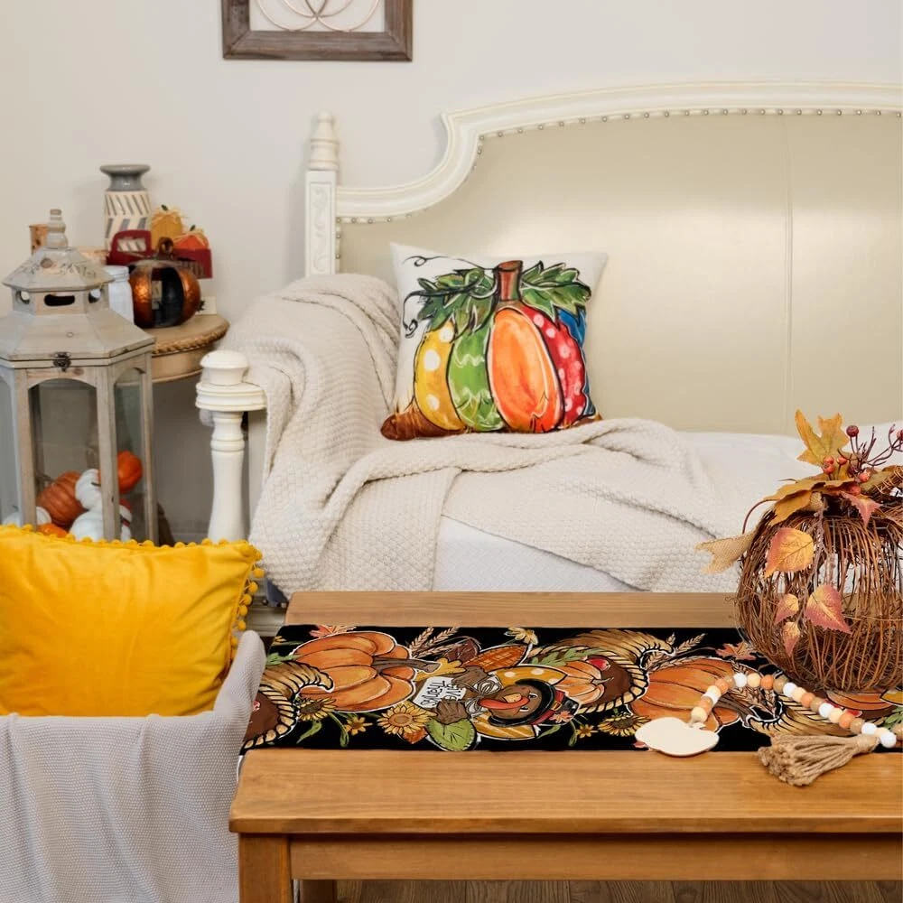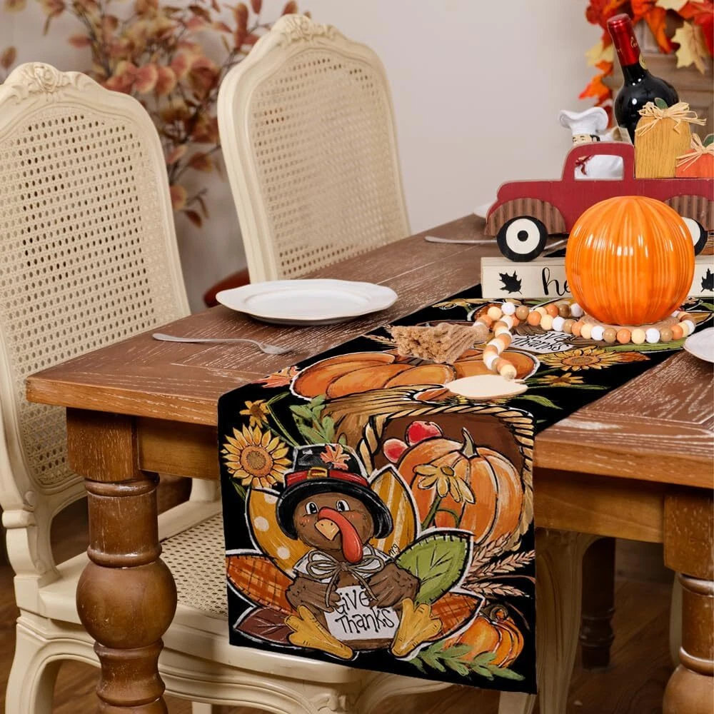 Thanksgiving Turkey Black Fall Table Runner 13x72 Inches Give Thanks Pumpkin ...