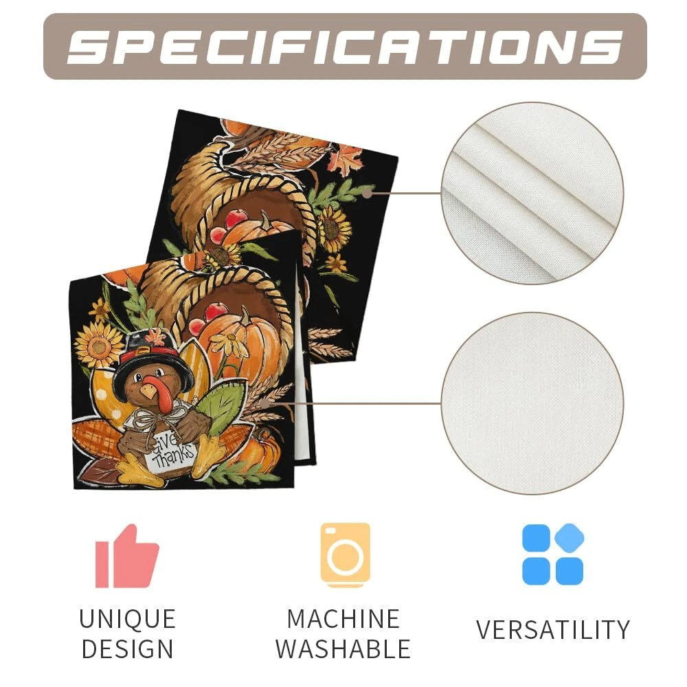 Thanksgiving Turkey Black Fall Table Runner 13x72 Inches, Give Thanks Pumpkin Holiday Indoor Outdoor Table Decoration for Home {Perfect Fall Thanksgiving Decoration}: Add a touch of autumn charm to your dining table with this 13 x 72-inch Fall Thanksgiving table runner, ideal for tables seating 4-8. {High-Quality Material}: Made from durable burlap-feel polyester fabric, designed to withstand daily use while maintaining a beautiful look. {Vibrant Thanksgiving Colors}: Features rich, seasonal hues of orange, brown, and gold, perfect for Fall and Thanksgiving gatherings. {Versatile Use}: Ideal for dining tables, mantels, coffee tables, and more; easily complements any Thanksgiving-themed decor. {Easy Care}: Machine washable for effortless cleaning; resists fading to keep colors vibrant season after season. Shipping We offer FREE shipping on all orders! We ship within Three business days of payment, usually sooner. We use a selection of shipping services such as UPS, FedEx, USPS etc. We only ship to the lower 48 states, no APO/FPO addresses or PO Boxes allowed. Local pickups and combined shipping options are not provided at this time. Return You can return a product for up to 30 days from the date you purchased it. Any product you return must be in the same condition you received it and in the original packaging. Please keep the receipt. Payment We accept payment by any of the following methods: PayPal Please pay as soon as possible after winning an auction, as that will allow us to post your item to you sooner! Feedback Customer satisfaction is very important to us. If you have any problem with your order, please contact us and we will do our best to make you satisfied. Contact Us If you have any queries, please contact us via ebay. We usually respond within 24 hours on weekdays. Please visit our eBay store to check out other items for sale! Thank you for shopping at our store.