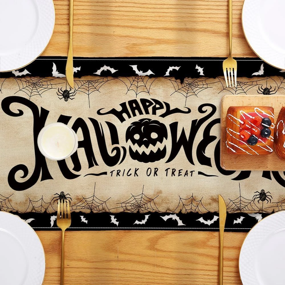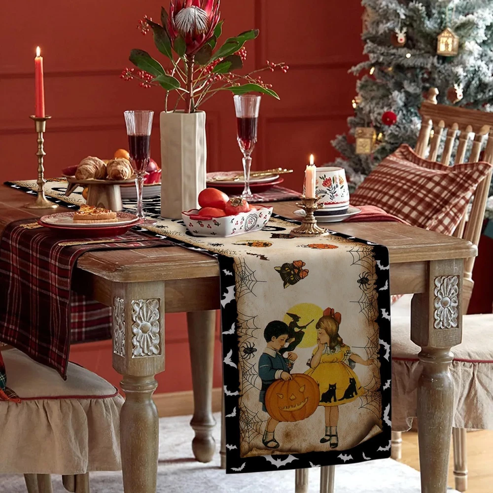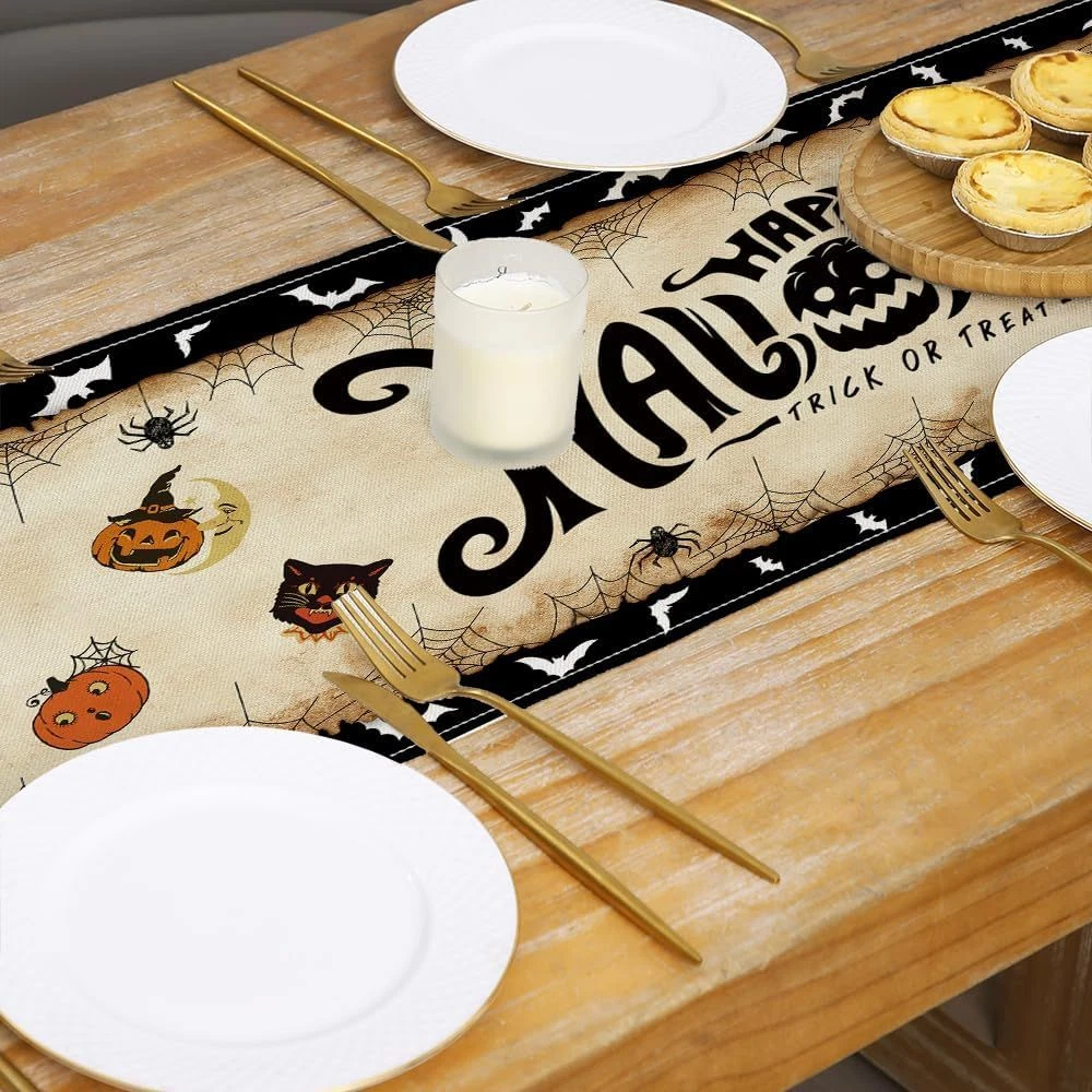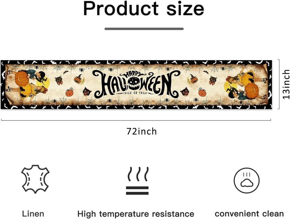 Vintage Halloween Table Runner Decorations - Black Product Details Product Dimensions: 72"L x 12"W Manufacturer: Racenaf Item Weight: 3.84 ounces Country of Origin: China Item model number: 01 Fabric Type: 100%linen Batteries required: No Included Components: Table Runner Color: Black Material: Linen Brand: Racenaf Pattern: Halloween Product Care Instructions: Machine Wash, Hand Wash, Line Dry, Do Not Bleach 100%linen VINTAGE HALLOWEEN TABLE RUNNER PACKAGE INCLUEDE: You will receive 13" x 72" (33*183 cm) vintage Halloween table runner. The retro Halloween table runner is very suitable as a Halloween decoration, make your cabin more Halloween atmosphere. UNIQUE DESIGN: The designs of this retro Halloween table runner are carefully selected, Use unique boy, girl, witch, pumpkin, other cute vintage Halloween elements and printed with black "HAPPY HALLOWEEN", "TRICK or TREAT" with vintage Halloween style theme. while also achieving an unparalleled visual effect can add a warm festive atmosphere to your family or party. HIGH QUALITY MATERIAL: Our Halloween table runner are made of premium linen, sturdy sewing, soft and durable, protecting your table's surface from hot pans, scratches, and spills. Machine washable or hand wash clean recommended on a cold water, hang to dry, don't bleach. APPLICABLE SCENE: This vintage Halloween table runner is perfect for rectangle table decorative perfect for can be used for your Halloween day theme party, holiday party, kitchen dining daily use, family gathering, indoor or outdoor decoration for Halloween holidays, special events celebration and more. Add to your Halloween atmosphere. PERFECT SERVICE: In celebrating the Halloween, customer satisfaction is our first purpose, If you have any questions about this Halloween table runner, please contact us, we will definitely give you a satisfactory answer within 12 hours. Sincerely wish you a Happy Halloween. Halloween Table Runner