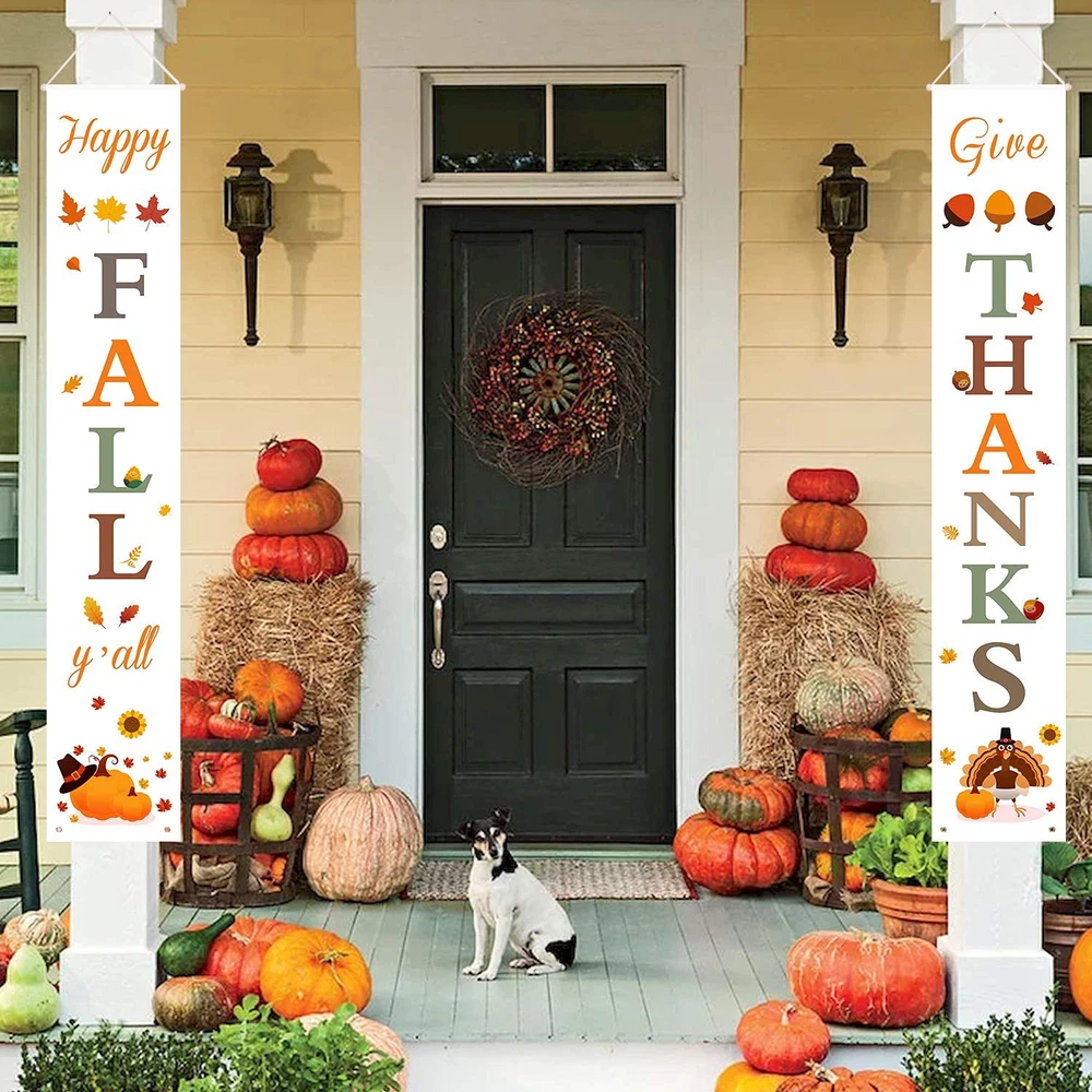 🍁 Versatile Thanksgiving Banner -- An easy but festive way to greet your guests and dress up your front door for Fall harvest season, adding warm hues and natural charm to your outdoor harvest decorations. 🍁 Rustic Fall Thanksgiving Decorations for Home -- The porch signs feature Happy Fall Y’all and Give Thanks Lettering with festive designs of leaf, acorn, pumpkin and turkey that make the fall colors truly pop and stand out. 🍁 Highly Durable Material -- Made of heavy duty fabric, sturdy, weather-resistant and easy to for future uses. Pre-assembled and ready to décor your home or office. 🍁 Decent Size -- Each banner measures 70"H x 13"W, fits perfectly indoor or outdoors and easy to hang on front door, porch, foyer, garage, or patio, or gracing an entryway! In addition, there are 2 grommet holes at the bottom to secure them against the wind. 🍁 Complete Your Thanksgiving Decorations -- Keep this decorative fall sign for your own home or give it as a gift to family and friends who enjoy fall décor accents for their own decorating needs.