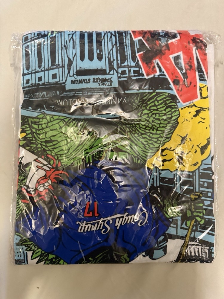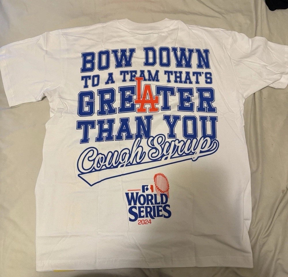 The "That's A Awful Lot of Cough Syrup" T-shirt in white, size medium, features a graphic print design with a crew neckline. Made from cotton jersey fabric, this regular fit T-shirt is machine washable and lightweight, making it suitable for all seasons. The shirt showcases the MLB 2024 World Series ‘LA Dodgers vs. NY Yankees’.