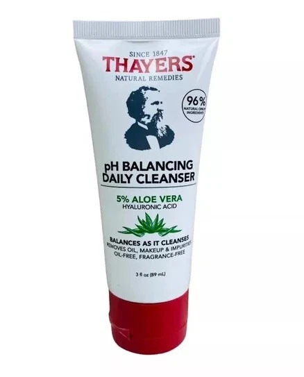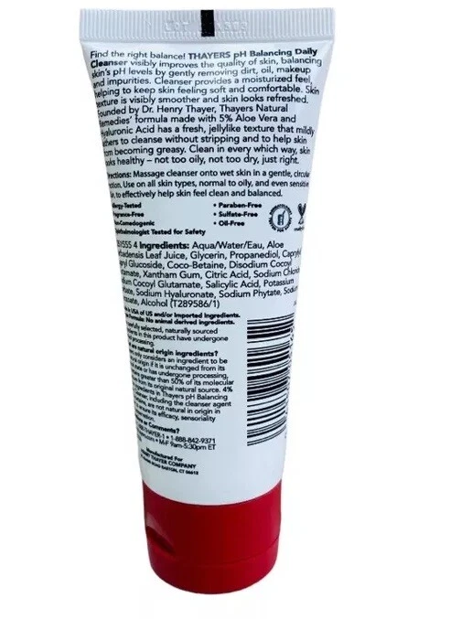 gtin13: 041507050365 Scent: Unscented Features: Animal Cruelty-Free, Contains Aloe Vera, Hydrating, Hypoallergenic, Nourishing, Oil-Free, Paraben-Free, pH Balanced, Phthalate-Free, Sulfate-Free, Vegan, Allergy Tested, 96% Natural Origin Ingredients, Fragrance Free, Non-Comedogenic, Ophthalmologist Tested, Contains Hyaluronic Acid, Contains Salicylic Acid Size: Regular MPN: 2818658 Formulation: Gel Body Area: Face, Neck Main Purpose: Acne, Blackheads, Clogged Pores, Dryness, Enlarged Pores, Excessive Oil, Remove Makeup, Stress Relief UPC: 041507050365 Country/Region of Manufacture: United States Department: Unisex Product Line: Thayers pH Balancing Daily Cleanser Skin Type: All Skin Types UVA Protection: N/A Period After Opening (PAO): 24M Sun Protection Factor (SPF): SPF 0 Type: Cleanser Active Ingredients: Aloe Vera, Hyaluronic Acid Expiration Date: None Listed Brand: Thayers Volume: 3 fl oz Ingredients: Glycerin, Salicylic Acid