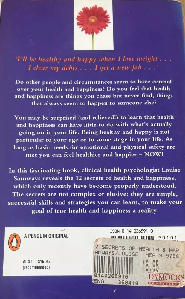 "The 12 Secrets of Health and Happiness by Louise Samways is a compelling non-fiction novel published by Penguin Books Ltd in 1998. This vintage paperback book, with a height of 198mm and a width of 128mm, delves into mind, body, and spirit topics, offering insights on self-help, health, and self-improvement. With 348 pages, this book is ideal for young adults and adults seeking practical advice on improving their overall well-being." Thank you for purchasing from A-ZCollective