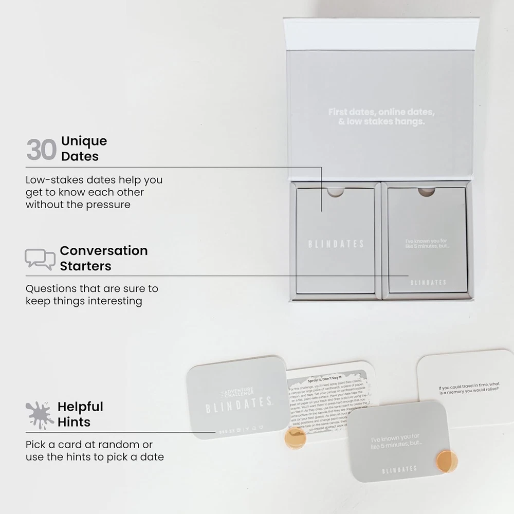 30 SCRATCH-OFF DATES PLUS 30 CONVERSATION STARTERS to help you laugh together and learn about each other. Easy date ideas without the pressure ??? no more awkward meetups or stale conversations at a 2-star restaurant bar. NO TAKE BACKS??? SORT OF: These couple games are all about "getting to know you" time. They encourage you to step outside your comfort zone, but don't pressure your date to step outside of theirs. PERFECT FOR SINGLES who want to have better dates with new love interests. Of course, these are SUPER fun adventures and games for couples both new and well-established. Be it a first date or longtime anniversary, there???s something for everyone. MAKE SOME MEMORIES: Netflix and chill? No thank you. These cards will get you out of the house. Even if you don't get a second date, at least you'll have a fun memory. That's what dating is all about! FREE TOTE WHEN YOU ORDER 3+ ITEMS: This Holiday season we are giving away our custom Adventure Challenge Tote with orders of 3 or more items from our entire catalog!