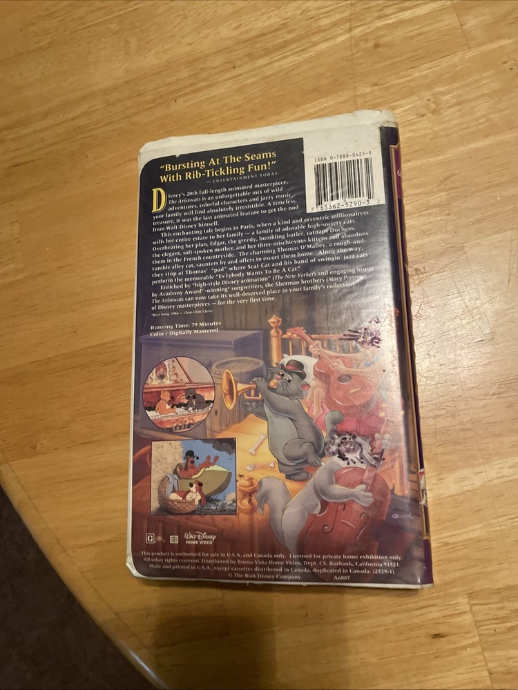 The Aristocats VHS 1996 Walt Disney Masterpiece Collection Clamshell is a classic animated film suitable for all ages. This G-rated movie features the talented voice of Eva Gabor and offers an adventure-packed storyline set in a magical world of fantasy and family-friendly charm. Disney's timeless piece, made in the United States, is sure to entertain audiences with its memorable songs and lovable characters. Perfect for nostalgic viewers and fans of animation & anime genres, this edition is a must-have for any Disney collection.