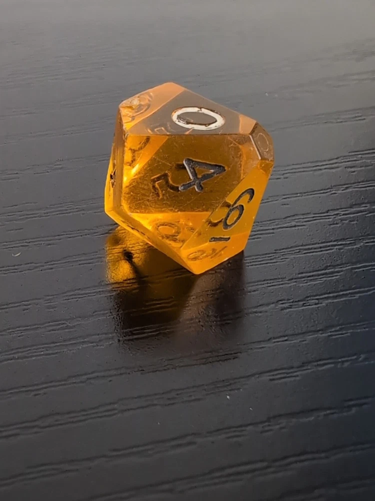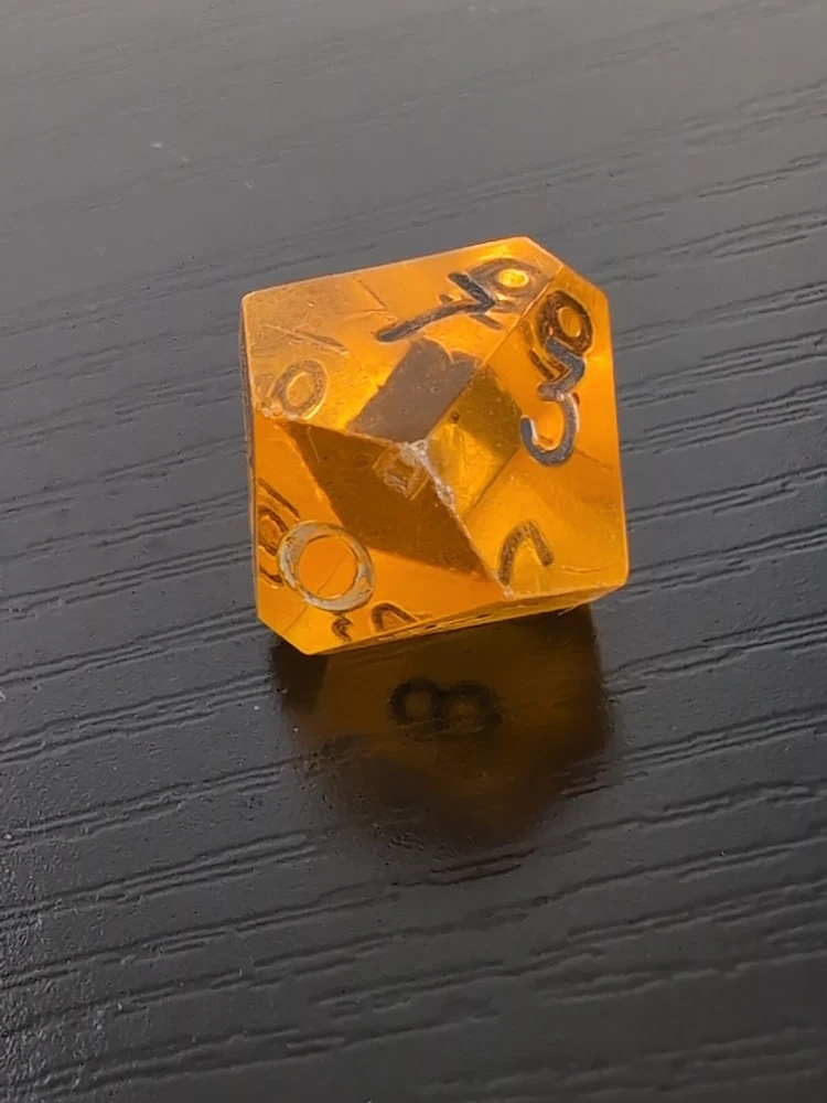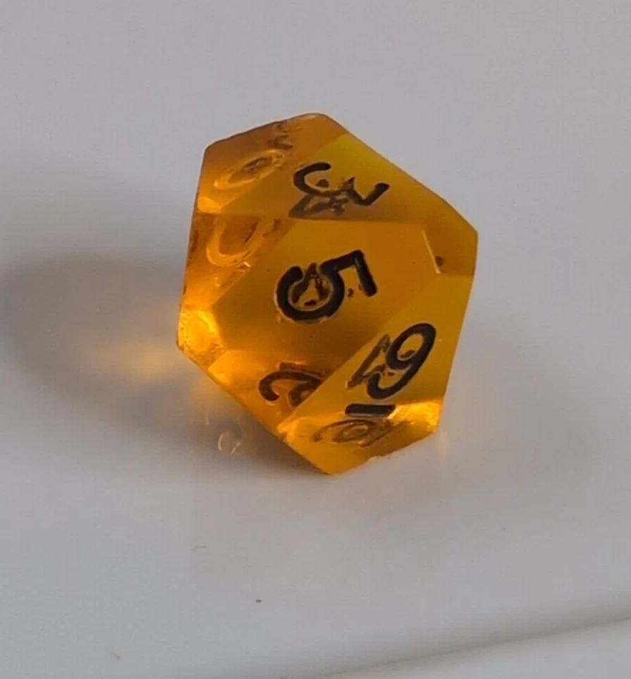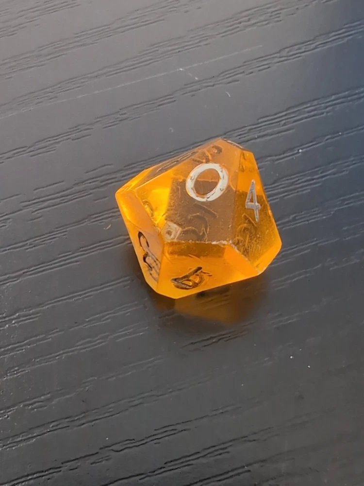 Amory d10 Injection mold circle. Sprue mark on the 0. Inked. Scratches from play. Some edge chipping. This is orange, but more topaz. If you need more pictures, or of something specific, please let me know. Happy to take more pictures! I have more dice listed in my store. Willing to combine shipping!