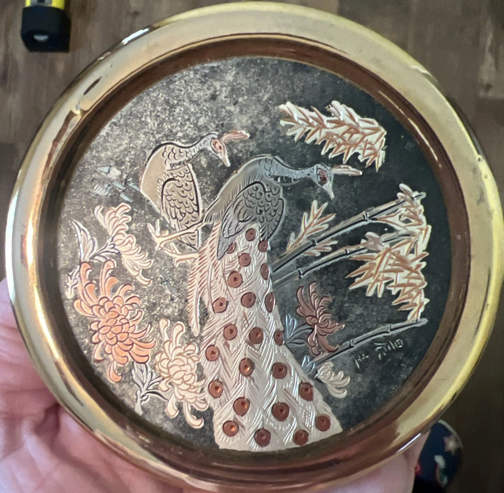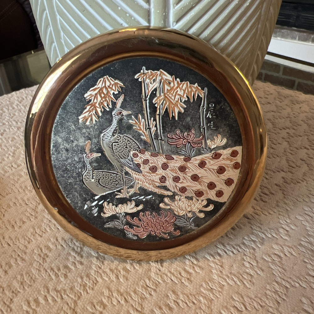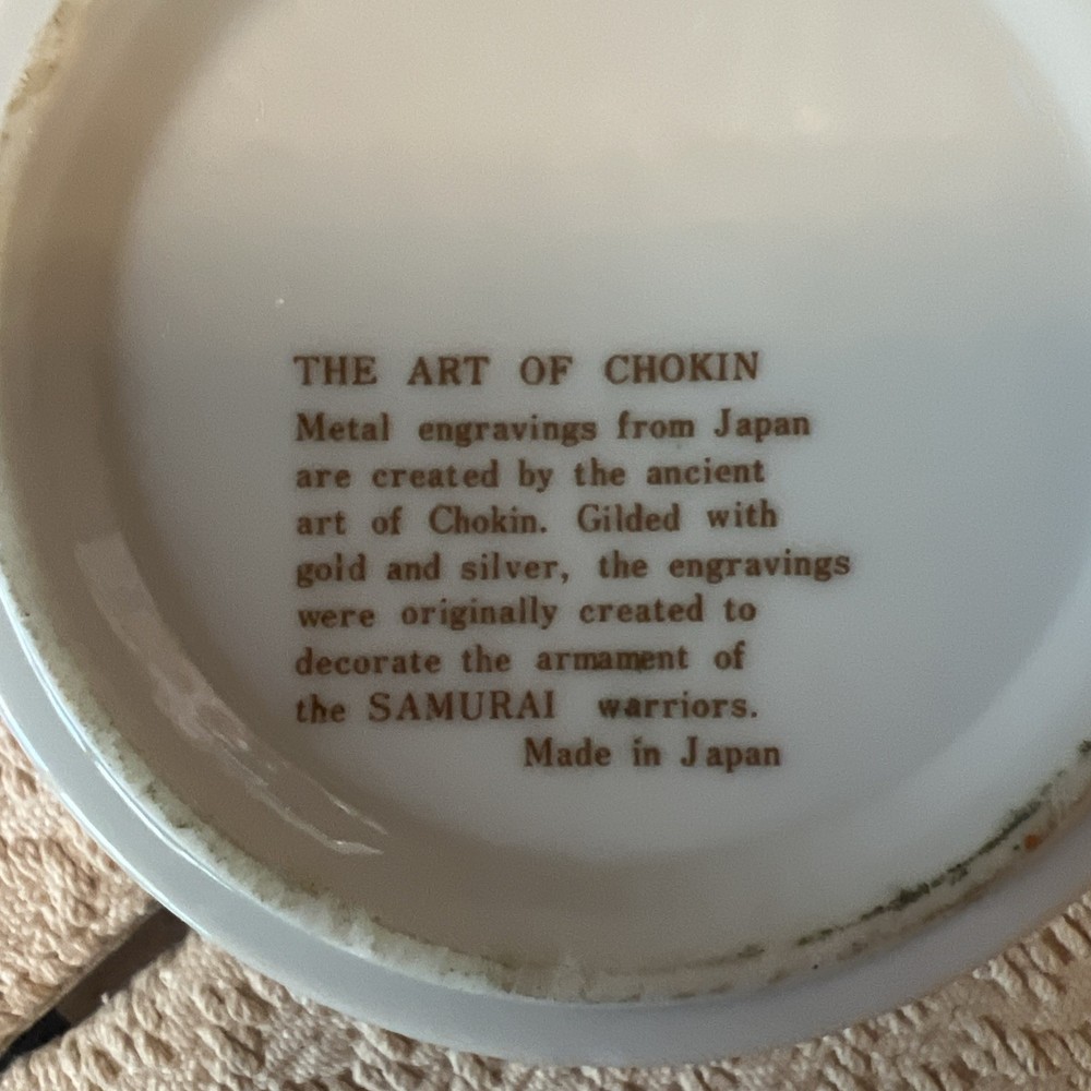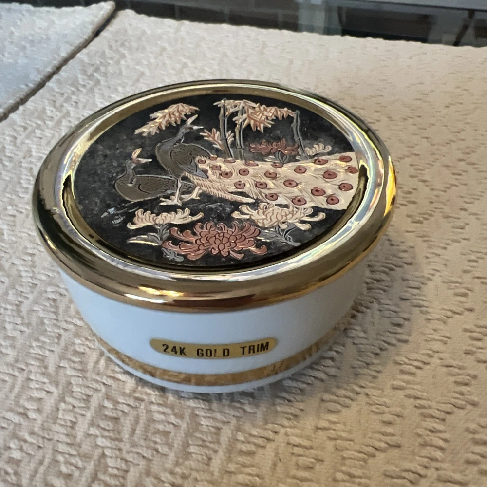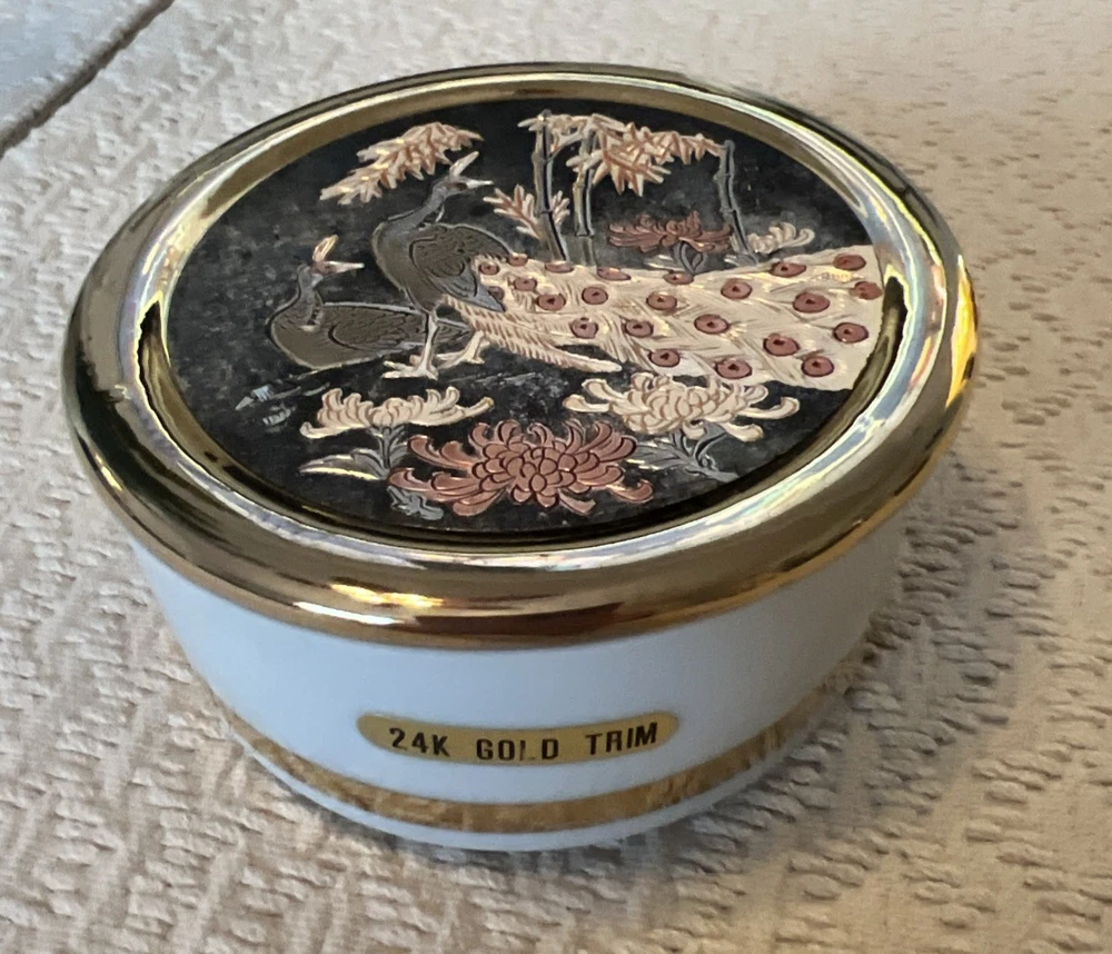 Experience the elegance of Asian artistry with this exquisite The Art of Chokin trinket box. Adorned with a stunning peacock motif, this porcelain dish is meticulously crafted in Japan, featuring a rich gold finish that exudes a timeless charm. The circular shape and 24 KT gold trim enhance its beauty, making it a sophisticated addition to any collection. This piece not only serves as a functional trinket box but also as a decorative accent that reflects a sense of luxury and tradition. Whether for personal use or as a thoughtful gift, it brings a touch of vintage flair and cultural richness to any setting.