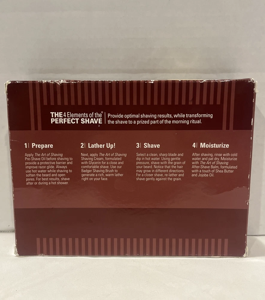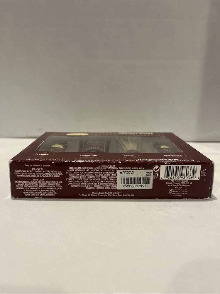 Brand:The Art Of ShavingType:Shaving KitUPC:0670535980339gtin13:0670535980339MPN:92112534Handle Material:PlasticCountry/Region of Manufacture:United StatesSet Includes:Shaving Brush, Pre Shave Oil, Shaving Cream, After Shave Balm