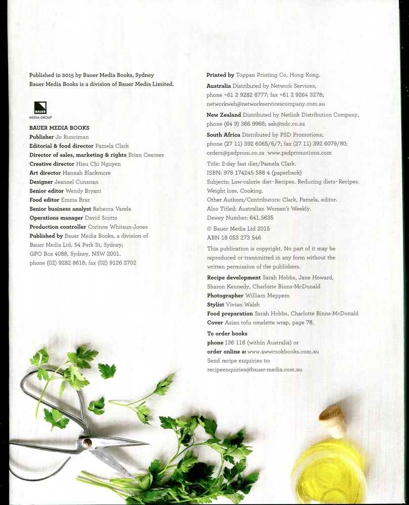While viewing this item, check out the other items I sell 2-Day FAST DIET ~ Follow our Delicious 2-day a week diet to lose weight the easy way ~ ~ All our recipes have been Triple-Tested in the AWW Test Kitchen ~ ~ To guarantee success first time, every time ~ The Australian Women's Weekly ISBN: 978-174245588-4 Reduce your kilojoule/calorie intake for just 2 days a week and still lose weight! Join the scores of people who have discovered the best way o dieting - eating less for just two days a week while eating normally on the other days. You'll find that after you've done this calorie restriction or 'fast' diet (2100kj/500 calories for women and 2500kj/600 calories for men) for several weeks, it becomes routine. The weight slowly comes off, and you begin to feel and look better, and you won't want to over-indulge on your regular eating days. And, of course, a little bit of exercise goes a long way to keeping the weight off and starting on the journey to a fit and healthy lifestyle. Includes a conversion chart for temperatures and measures. Description: Cover : Paperback Published : Not known Publisher : Bauer Media Books ISBN : 978-174245588-4 Condition : Like New Size: 210mm x 259mm x 12mm Weight: 516 grams
