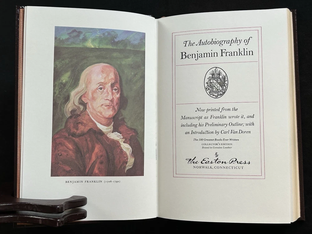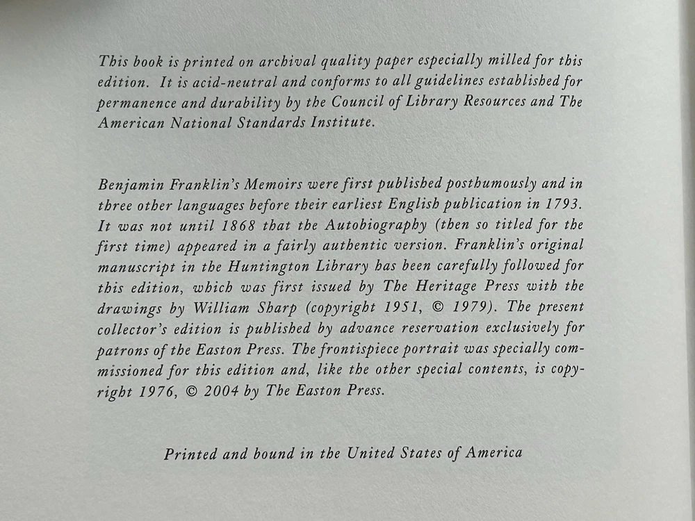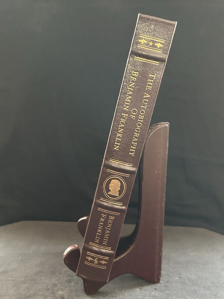 This volume is in excellent condition. Though it has been unwrapped, it has never been read. I am the only person who has ever owned this book and it’s been in my bookcase undisturbed for years. The book still cracks when you open it and has not been handled much at all. In fact I am the only person to ever touch this book. The only way they have ever been cleaned is a light dusting with a clean, dry microfiber cloth. Featuring acid-neutral archival quality paper, 22k gold accents, a satin ribbon page marker, moire fabric end sheets, and beautiful leather binding; this book is a fantastic addition to any collector’s library. This collector’s edition of The Autobiography Of Benjamin Franklin is a must-have for any fan of classic literature. This Easton Press edition was made for collectors of fine books. Feel free to ask any questions you may have as there are no returns on this purchase. It has a shipping weight of about 5 pounds. I will pack it with extreme care to ensure you will receive the book in the same beautiful condition it is in now. Your satisfaction is important to me. I appreciate your interest in my wares and look forward to doing business with you. Thank you. -Steve