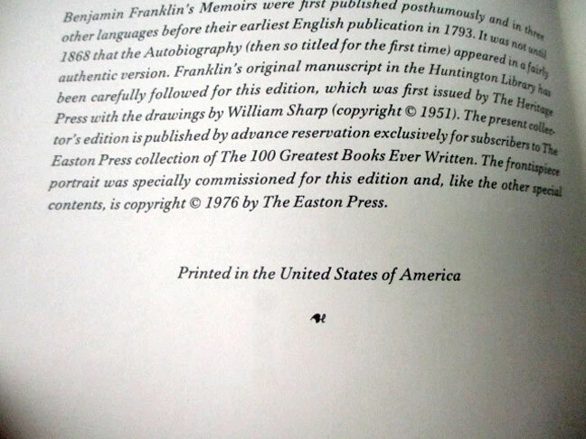 ENLARGED PICTURES!! Please scroll ALL the way down to view LARGER images. 3X 494. Intro by Carl Van Doran. Color Frontispiece Portrait. 4 Double page city maps, in front (please see pictures). Collectors Edition, "700 Best Books Ever Written" Series. Pub. Easton Press, Norwalk, Connecticut. 1976. 10 1/8" Tall. 233 pages. All Edges Gilt. Full reddish brown leather. Gilt decor. Silk end papers. Near Fine condition. Please do not hesitate to e-mail with any questions. As Always, Satisfaction Guaranteed! PAYMENT: PayPal, because eBay requires sellers to list electronic payments exclusively. I expect to receive payment within 10 days, unless we have made other arrangements. MEDIA MAIL: The majority of my books are sent Media Mail to U.S. customers. I add $1.00 for shipping materials, etc. (The shipping price that you see at the top of the page includes the handling fee.) PRIORITY MAIL: I will send both Media cost and Priority cost with invoice, on books which seem to warrant Priority service or when buyer requests it. I'm glad to combine multiple purchases in order to minimize shipping costs. I WILL SHIP INTERNATIONALLY, and I try to be as economical as possible with the shipping costs. Whenever a book will fit comfortably in a Priority Flat Rate Envelope, I'll send it that way. RETURN POLICY: Satisfaction Guaranteed! Payment I accept the following forms of payment: PayPal Shipping & Handling I'm glad to combine multiple purchases for less expensive shipping costs. US Shipping $5.00 USPS Media Mail® International Shipping $32.00 USPS Priority Mail International FREE scheduling, supersized images and templates. Get Vendio Sales Manager. FREE scheduling, supersized images and templates. Get Vendio Sales Manager. Over 100,000,000 served. Get FREE counters from Vendio today!
