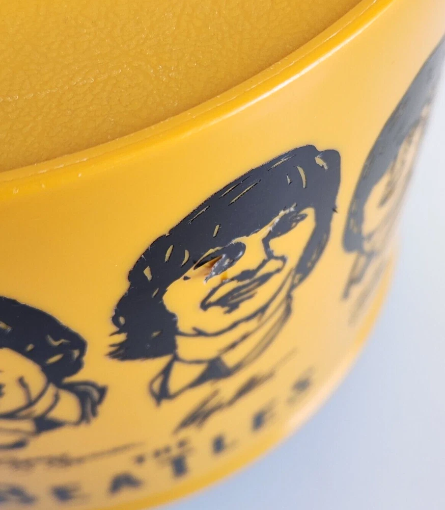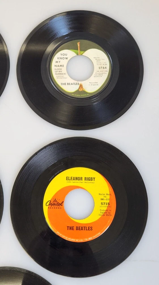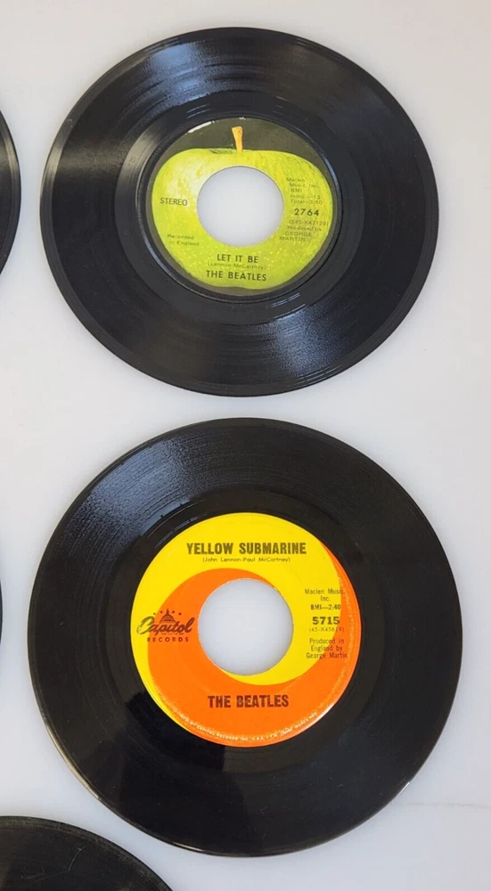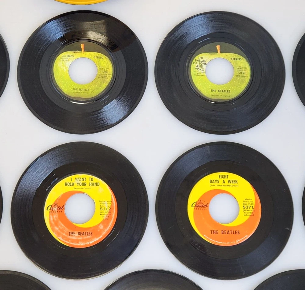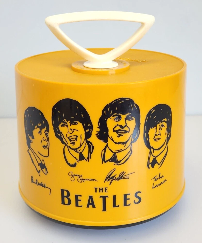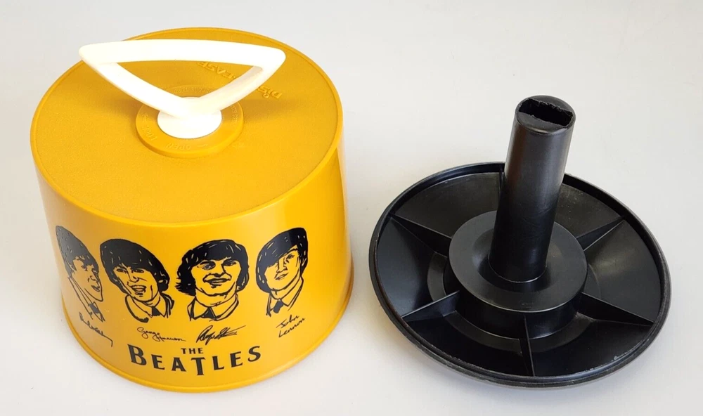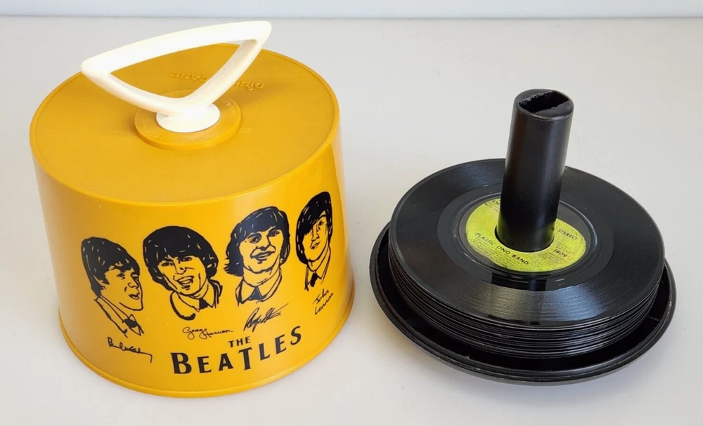 The Beatles Disk-Go-Case 1966 Nems Yellow 45RPM Vinyl Record Carrier, 14 Singles "Disk-Go-Case" 45 RPM 7" Vinyl Record Case The Beatles - Paul McCartney, George Harrison, Ringo Starr & John Lennon Yellow ©1966 NEMS Enterprises, Ltd. (missing sticker) 14x 7" Vinyl Single Records Included: The Plastic Ono Band - Give Peace A Chance / Remember Love - 1809 The Beatles - Hey Jude / Revolution - 2276 The Beatles with Billy Preston - Get Back / Don't Let Me Down - 2490 The Beatles - The Ballad Of John And Yoko / Old Brown Shoe - 2531 The Beatles - Let It Be / You Know My Name - 2764 George Harrison - My Sweet Lord / Isn't It A Pity - 2995 The Beatles - I Want To Hold Your Hand / I Saw Her Standing There - 5112 The Beatles - I Want To Hold Your Hand / I Saw Her Standing There - 5112 The Beatles - Eight Days A Week / I Don't Want To Spoil The Party - 5371 The Beatles - Yellow Submarine / Eleanor Rigby - 5715 John Lennon, Plastic Ono Band - Imagine / It's So Hard - 1840 The Beatles - Please Please Me / From Me To You - VJ 581 The Beatles - Love Me Do / P.S. I Love You - T-9008 The Beatles - She Loves You / I'll Get You - S-4152 Items are used with signs of wear. The Disk-Go-Case is in nice working condition and free of any cracks or other major damage. The "©1966 NEMS Enterprises, Ltd." stickers are missing from the front graphics. Ringo Starr's right eye sticker is starting to peel (see pic). There are light scuffs and dust due to regular use. The vinyl albums are all well worn with small scratches, dust and wear due to previous use. Includes only items pictured. Please view photos for more detail. Thank you 081624 NS AAJ-J2