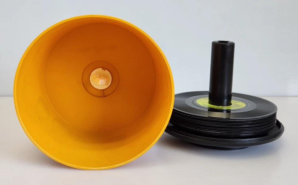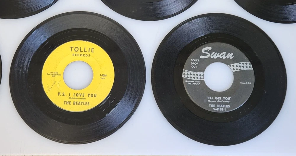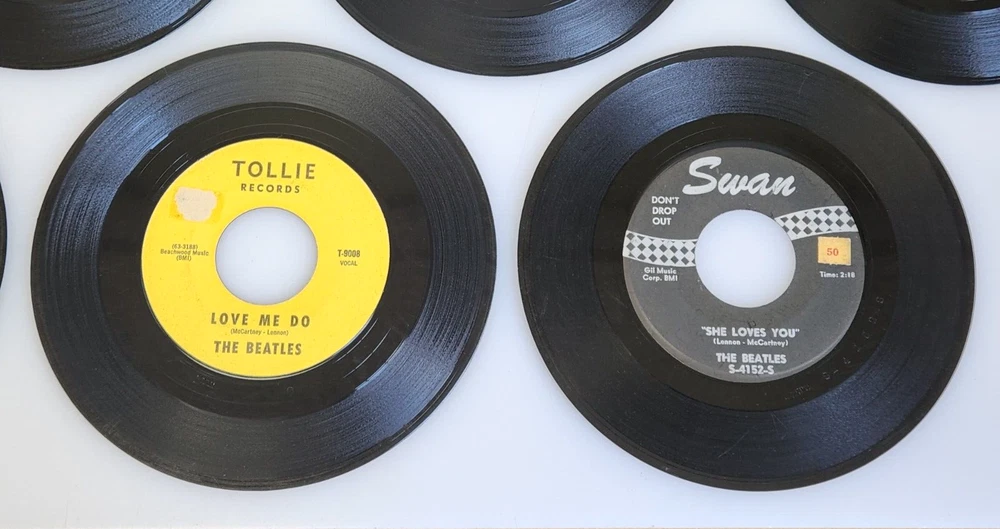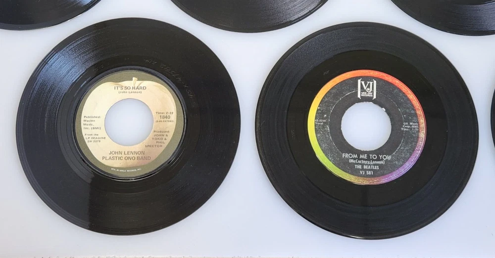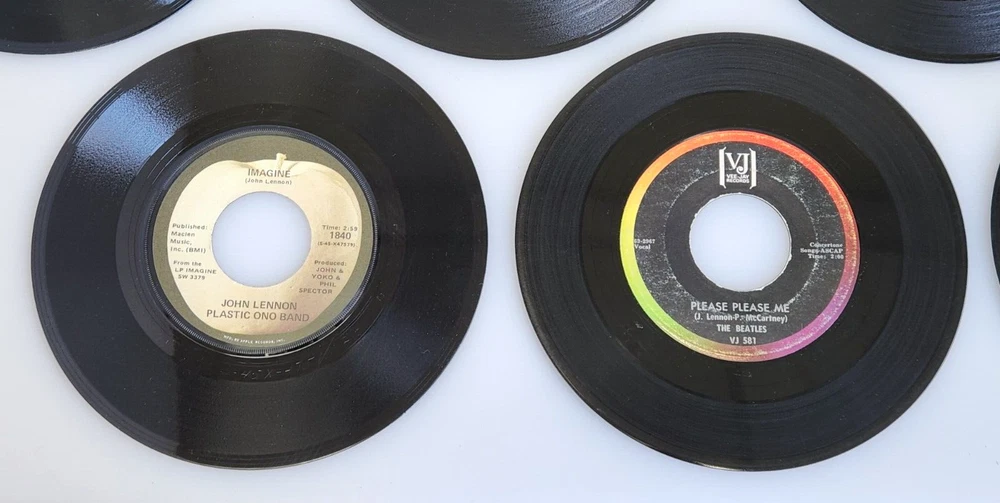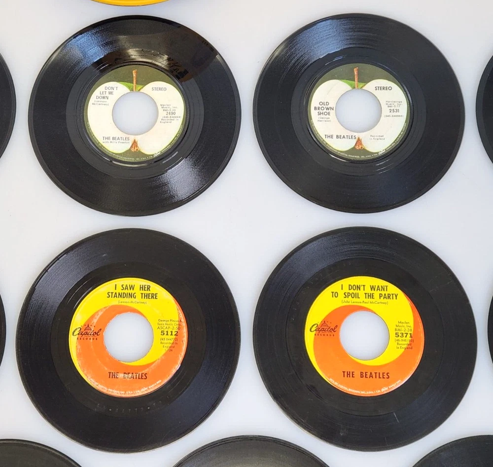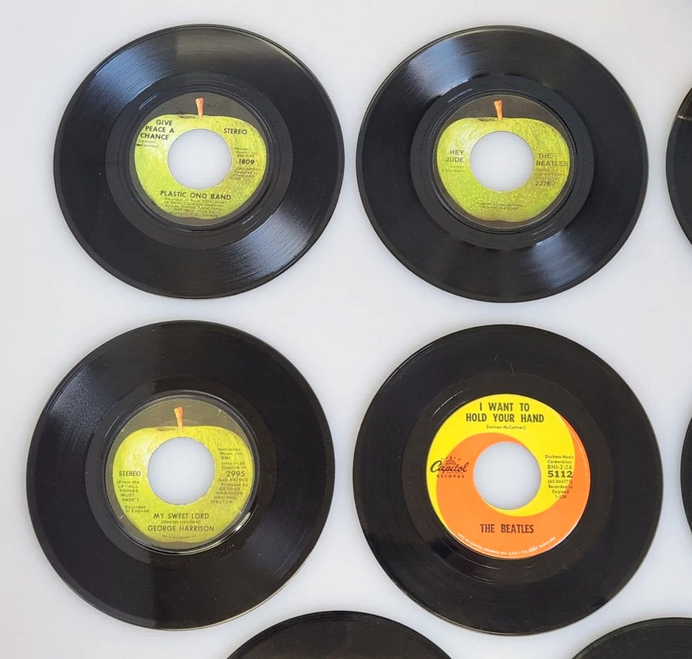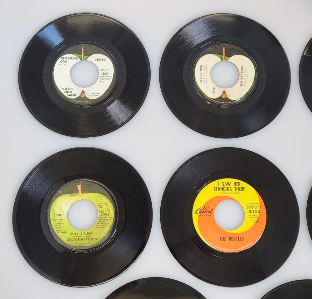 The Beatles Disk-Go-Case 1966 Nems Yellow 45RPM Vinyl Record Carrier, 14 Singles "Disk-Go-Case" 45 RPM 7" Vinyl Record Case The Beatles - Paul McCartney, George Harrison, Ringo Starr & John Lennon Yellow ©1966 NEMS Enterprises, Ltd. (missing sticker) 14x 7" Vinyl Single Records Included: The Plastic Ono Band - Give Peace A Chance / Remember Love - 1809 The Beatles - Hey Jude / Revolution - 2276 The Beatles with Billy Preston - Get Back / Don't Let Me Down - 2490 The Beatles - The Ballad Of John And Yoko / Old Brown Shoe - 2531 The Beatles - Let It Be / You Know My Name - 2764 George Harrison - My Sweet Lord / Isn't It A Pity - 2995 The Beatles - I Want To Hold Your Hand / I Saw Her Standing There - 5112 The Beatles - I Want To Hold Your Hand / I Saw Her Standing There - 5112 The Beatles - Eight Days A Week / I Don't Want To Spoil The Party - 5371 The Beatles - Yellow Submarine / Eleanor Rigby - 5715 John Lennon, Plastic Ono Band - Imagine / It's So Hard - 1840 The Beatles - Please Please Me / From Me To You - VJ 581 The Beatles - Love Me Do / P.S. I Love You - T-9008 The Beatles - She Loves You / I'll Get You - S-4152 Items are used with signs of wear. The Disk-Go-Case is in nice working condition and free of any cracks or other major damage. The "©1966 NEMS Enterprises, Ltd." stickers are missing from the front graphics. Ringo Starr's right eye sticker is starting to peel (see pic). There are light scuffs and dust due to regular use. The vinyl albums are all well worn with small scratches, dust and wear due to previous use. Includes only items pictured. Please view photos for more detail. Thank you 081624 NS AAJ-J2