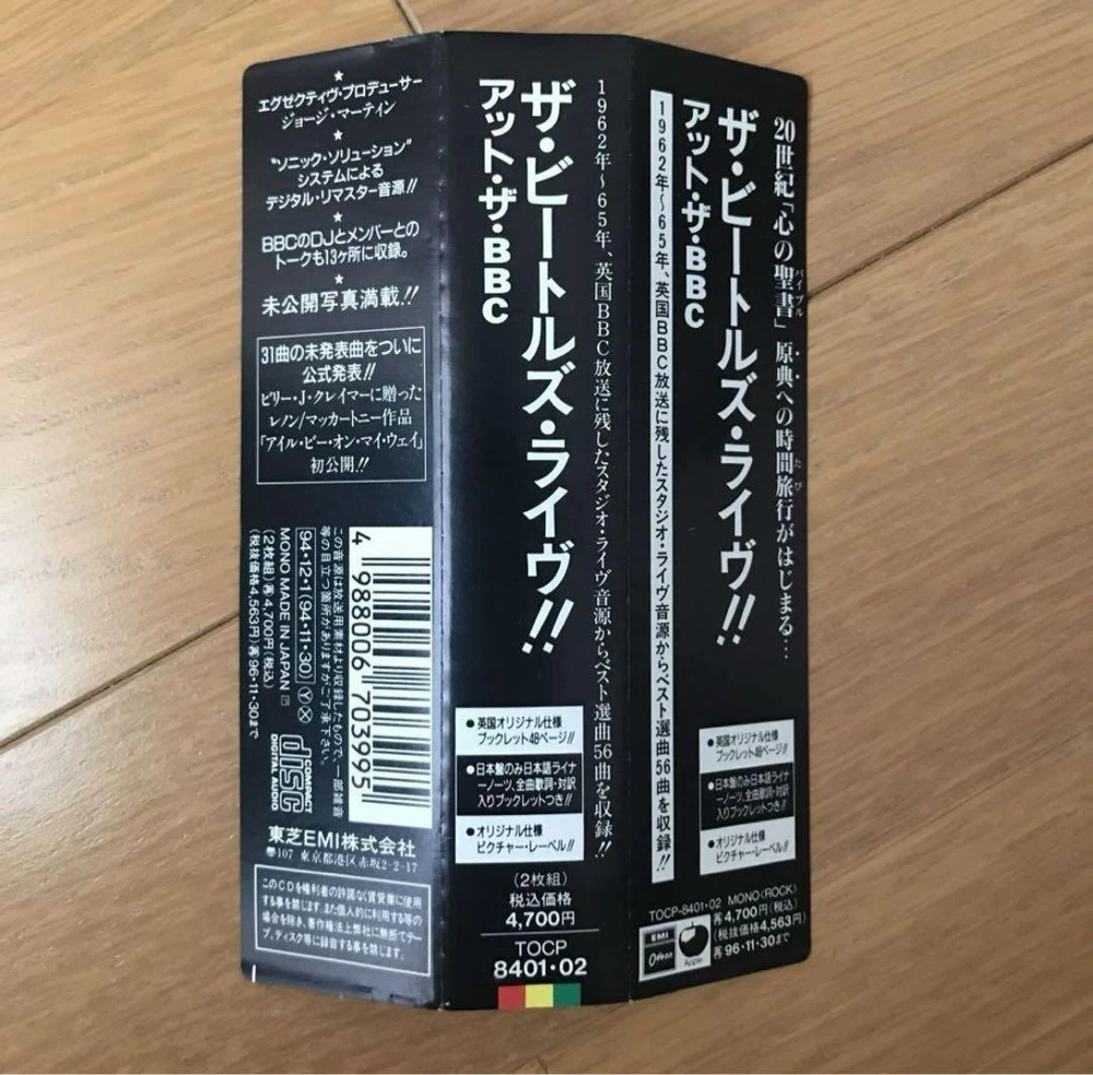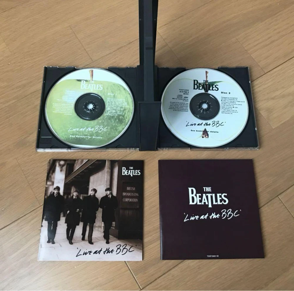 Description A Beatles album released as a two-disc set on November 30, 1994. Contains the best 56 songs from live studio recordings broadcast on BBC Radio in the UK from 1962 to 1965. This is the first official album of unreleased songs since 1977's ``The Beatles Super Live!''. The executive producer is George Martin. Digitally remastered sound source by Sonic Solution System. Talks with BBC DJs and members are also recorded at 13 locations. Full of unreleased photos! Japanese edition CD. Comes with a booklet with lyrics and commentary (Japanese). 1994 Toshiba EMI The case has some signs of use, but the disc surface is in good condition with no noticeable damage and can be played on a home CD player without any problems. 1-01 Beatle Greetings (Speech) 1-02 From Us To You 1-03 Riding On A Bus (Speech) 1-04 I Got A Woman 1-05 Too Much Monkey Business 1-06 Keep Your Hands Off My Baby 1-07 I’ll Be On My Way 1-08 Young Blood 1-09 A Shot Of Rhythm And Blues 1-10 Sure To Fall (In Love With You) 1-11 Some Other Guy 1-12 Thank You Girl 1-13 Sha La La La La! (Speech) 1-14 Baby It’s You 1-15 That’s All Right (Mama) 1-16 Carol 1-17 Soldier Of Love 1-18 A Little Rhyme (Speech) 1-19 Clarabella 1-20 I’m Gonna Sit Right Down And Cry (Over You) 1-21 Crying, Waiting, Hoping 1-22 Dear Wack! (Speech) 1-23 You Really Got A Hold On Me 1-24 To Know Her Is To Love Her 1-25 A Taste Of Honey 1-26 Long Tall Sally 1-27 I Saw Her Standing There 1-28 The Honeymoon Song 1-29 Johnny B Goode 1-30 Memphis, Tennessee 1-31 Lucille 1-32 Can’t Buy Me Love 1-33 From Fluff To You (Speech) 1-34 Till There Was You 2-01 Crinsk Dee Night (Speech) 2-02 A Hard Day’s Night 2-03 Have A Banana! (Speech) 2-04 I Wanna Be Your Man 2-05 Just A Rumour (Speech) 2-06 Roll Over Beethoven 2-07 All My Loving 2-08 Things We Said Today 2-09 She’s A Woman 2-10 Sweet Little Sixteen 2-11 1822! (Speech) 2-12 Lonesome Tears In My Eyes 2-13 Nothin’ Shakin’ 2-14 The Hippy Hippy Shake 2-15 Glad All Over 2-16 I Just Don’t Understand 2-17 So How Come (No One Loves Me) 2-18 I Feel Fine 2-19 I'm A Loser 2-20 Everybody's Trying To Be My Baby 2-21 Rock And Roll Music 2-22 Ticket To Ride 2-23 Dizzy Miss Lizzy 2-24 Medley: Kansas City/Hey! Hey! Hey! Hey! 2-25 Set Fire To That Lot! (Speech) 2-26 Matchbox 2-27 I Forgot To Remember To Forget 2-28 Love These Goon Shows! (Speech) 2-29 I Got To Find My Baby 2-30 Ooh! My Soul 2-31 Ooh! My Arms (Speech) 2-32 Don't Ever Change 2-33 Slow Down 2-34 Honey Don't 2-35 Love Me Do Label: Apple Records – TOCP-8401・02, Odeon – TOCP-8401・02, Apple Records – 8 31797~98 2, Odeon – 8 31797~98 2 Format: 2 x CD, Album, Remastered, Mono Country: Japan Released: 1994年12月1日 Genre: Rock, Non-Music, Pop Style: Beat, Rock & Roll, Rockabilly, Speech, Interview If you have any questions, please do not hesitate to ask. ^_^ Policy Payment You can use various payment methods based on eBay Managed Payments. Import duties, taxes and charges are not included in the item price or shipping charges. These charges are the buyer's responsibility. Shipping Expedited Shipping We always send the item with a tracking number. So please place an order without any concern on delivery. You can always track the delivery status. Shipping is only available to the address registered in eBay. If you want us to send another address, please change your address on eBay and then place an order. Shipping is available from Monday to Friday. Weekends are not available because freight companies are closed. Economy Shipping Delivery in 2-4 weeks. It may be delayed depending on the area and weather. Without tracking number. Cancellations & Returns Cancellation or returns will be accepted only if the item has an obvious problem that was not mentioned in the listing description. If that, please let us know within 3 days you got the item. Buyer is responsible for shipping costs and any charge incurred shipping products back. International Buyers Import duties, taxes and charges are not included in the item price or shipping charges. These charges are the buyer's responsibility. Please check with your country's customs office to determine what these additional costs will be prior to bidding/buying. These charges are normally collected by the delivering freight (shipping) company or when you pick the item up - do not confuse them for additional shipping charges.
