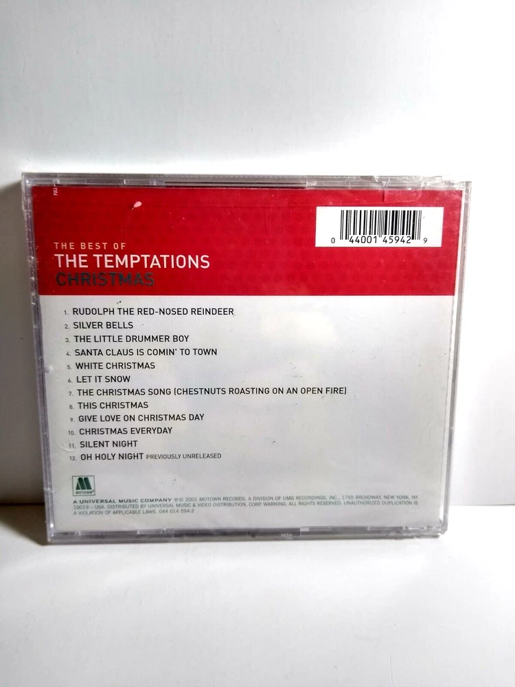 Get into the holiday spirit with this Best of Temptations Christmas CD album. Featuring soulful and funky tracks released under Motown and Mot labels, this album is a must-have for any fan of the Temptations. With a standard jewel case and CD grading of Mint (M), this album is perfect for collectors and music enthusiasts alike. The album was produced by Barrett Strong and Gil Askey, and features a variety of Christmas vocal genres. The CD comes sealed and is in excellent case and inlay conditions. Released in 2001, this album is a great addition to any Christmas music collection. SEALED NEW CD. Has old price sticker on front of plastic.