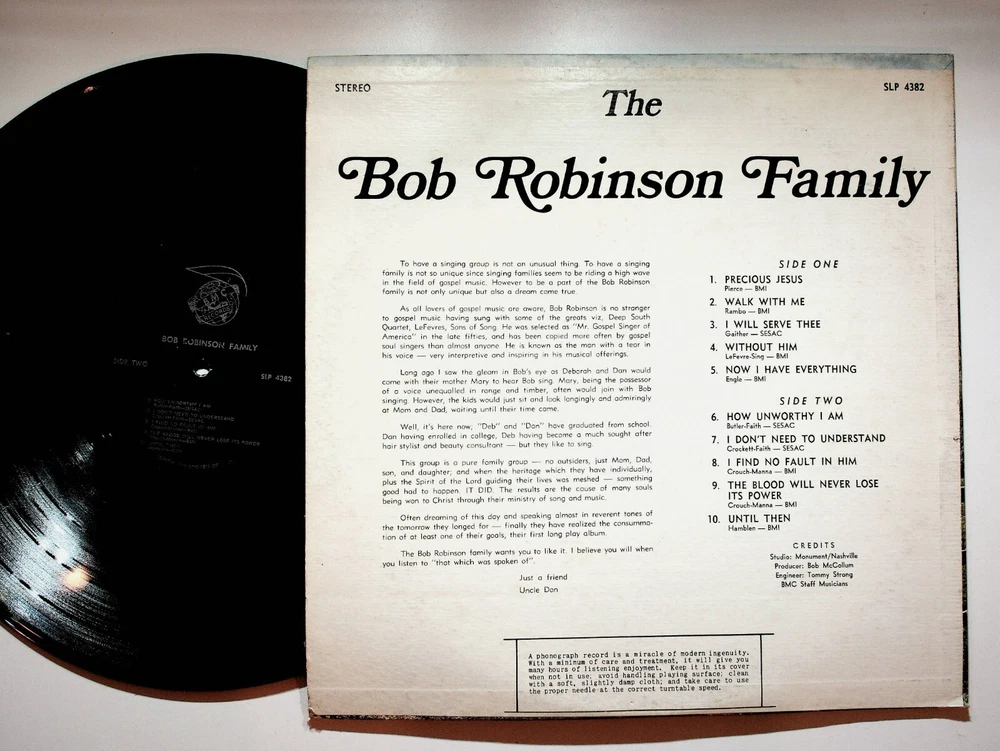 Yes we combine shipping for multiple purchases. Add multiple items to your cart and the combined shipping total will automatically be calculated. The Bob Robinson Family That Which Was Spoken Of Gospel Vinyl LP Record VG+ Vinyl / Jacket Grade Per Goldmine Standard: VG+ / VG+ SIDE ONE 1. PRECIOUS JESUS Pierce — BMI 2. WALK WITH ME Rambo — BMI 3. I WILL SERVE THEE Gaither — SESAC 4. WITHOUT HIM LeFevre-Sing — BMI 5. NOW I HAVE EVERYTHING Engle — BMI SIDE TWO 6. HOW UNWORTHY I AM Butler-Faith — SESAC 7. I DON'T NEED TO UNDERSTAND Crockett-Faith — SESAC 8. I FIND NO FAULT IN HIM Crouch-Manna — BMI 9. THE BLOOD WILL NEVER LOSE ITS POWER Crouch-Manna — BMI 10. UNTIL THEN Hamblen — BMI To have a singing group is not an unusual thing To have a singing family is not so unique since singing families seem to be riding a high wave in the field of gospel music. However to be a part of the Bob Robinson family is not only unique but also a dream come true. As all lovers of gospel music are aware, Bob Robinson is no stranger to gospel music having sung with some of the greats viz, Deep South Quartet, LeFevres, Sons of Song He was selected as "Mr Gospel Singer of America" in the late fifties, and has been copied more often by gospel soul singers than almost anyone. He is known as the man with a tear in his voice — very interpretive and inspiring in his musical offerings Long ago I saw the gleam in Bob's eye as Deborah and Dan would come with their mother Mary to hear Bob sing Mary, being the possessor of a voice unequalled in range and timber, often would join with Bob singing However, the kids would just sit and look longingly and admiringly at Mom and Dad, waiting until their time come Well, it's here now; "Deb" and "Dan" have graduated from school Dan having enrolled in college, Deb having become a much sought after hair stylist and beauty consultant — but they like to sing This group is a pure family group — no outsiders, just Mom, Dad, son, and daughter; and when the heritage which they have individually, plus the Spirit of the Lord guiding their lives was meshed — something good had to happen IT DID The results are the cause of many souls being won to Christ through their ministry of song and music. Often dreaming of this day and speaking almost in reverent tones of the tomorrow they longed for — finally they have realized the consumma- tion of at least one of their goals, their first long play album. The Bob Robinson family wants you to like it. I believe you will when you listen to "that which was spoken of". Just a friend Uncle Don CREDITS Studio: Monument/Nashville Producer: Bob McCollum Engineer: Tommy Strong BMC Staff Musicians Thank you for your business. Gallimoresgoods