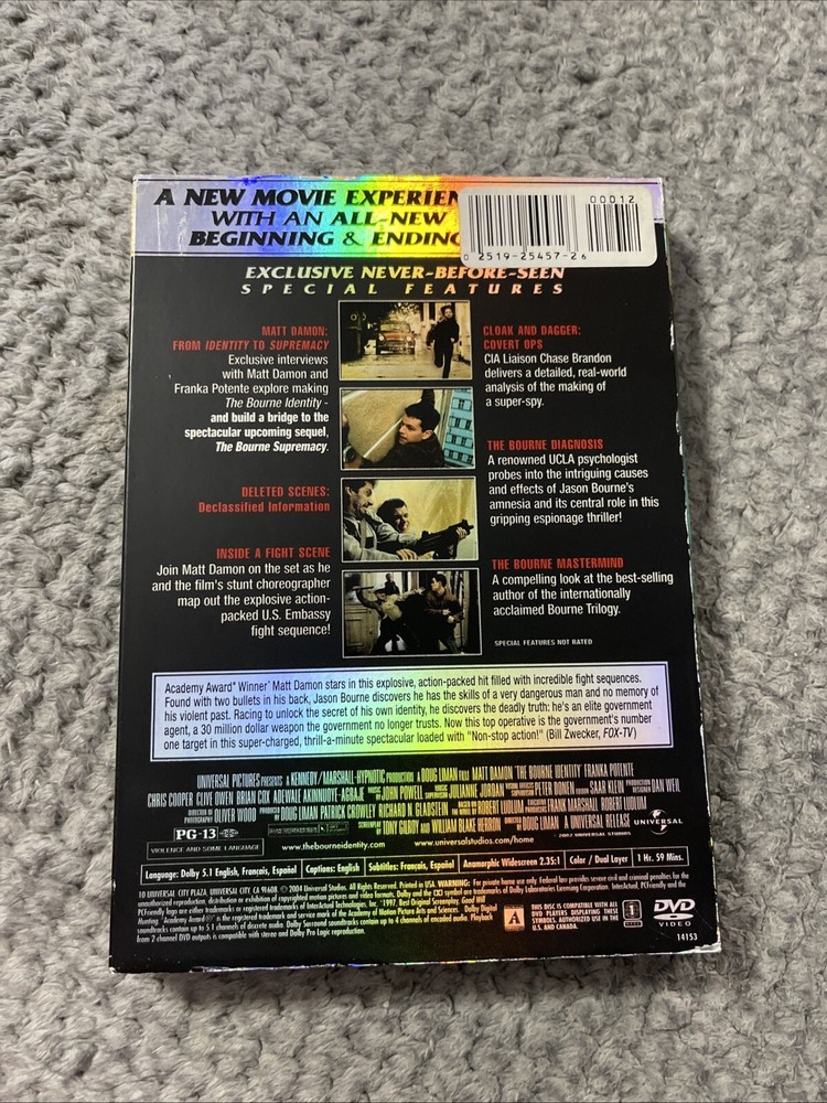 The Bourne Identity (Widescreen Extended Edition) DVDs is an action-packed adventure movie featuring Matt Damon and Franka Potente. Released in 2004, this movie is rated PG-13 and directed by Doug Liman. The DVDs come in the DVD format and feature widescreen display. This extended edition is a must-have for fans of the Bourne franchise, with its explosive action and thrilling plot twists. The movie takes you on a journey of identity and redemption, as Bourne seeks answers to his past and fights to save the world from destruction. Get your hands on this DVD set and experience the ultimate adventure.
