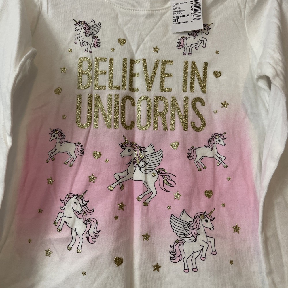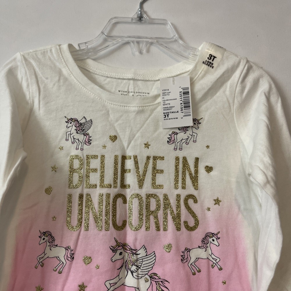 This Children's Place Girls 3t White Cotton Unicorn Long-Sleeved Shirt is a stylish and comfortable t-shirt perfect for young girls who love unicorns. Made from soft cotton material, this shirt features a graphic print of unicorns, adding a fun and whimsical touch to any outfit. With long sleeves and a classic white color, this shirt is a versatile and playful addition to any girl's wardrobe.