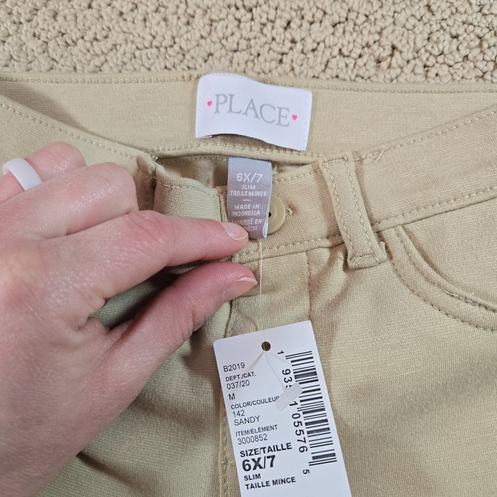 The Children's Place Girls 6x/7 Slim Khaki Pull On Jeggings are a stylish and comfortable option for young girls. Made from a blend of polyester, spandex, and cotton, these jeggings feature a pull-on closure for easy wear. With a slim fit and low rise, they are perfect for casual occasions and can be machine washed for easy care. The solid tan color and comfortable stretch make them suitable for all seasons, whether it be winter, summer, fall, or spring. Ideal for school or everyday wear, these jeggings from The Children's Place offer both style and practicality for active kids. (367) Waist = 20" Rise = 7.5" Length/Inseam = 20" 59% Cotton, 36% Polyester, 5% Spandex