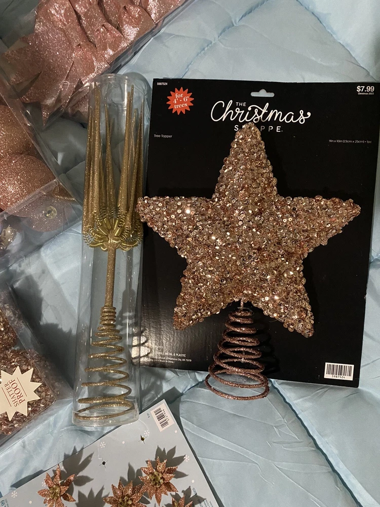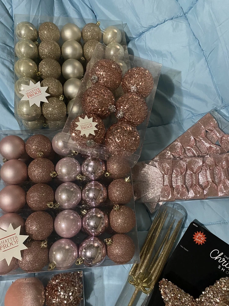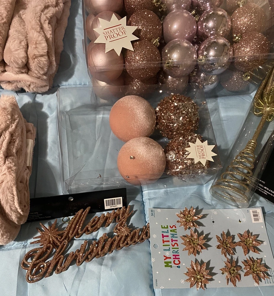 1 pink plush tree skirt 2 pink plush table runners 8 pink plush placemats 110 pink and light tan/gold ornaments, shatter proof 12 pink bow ornaments 2 tree toppers one pink, one gold 7 mini pink and gold poinsettia ornaments