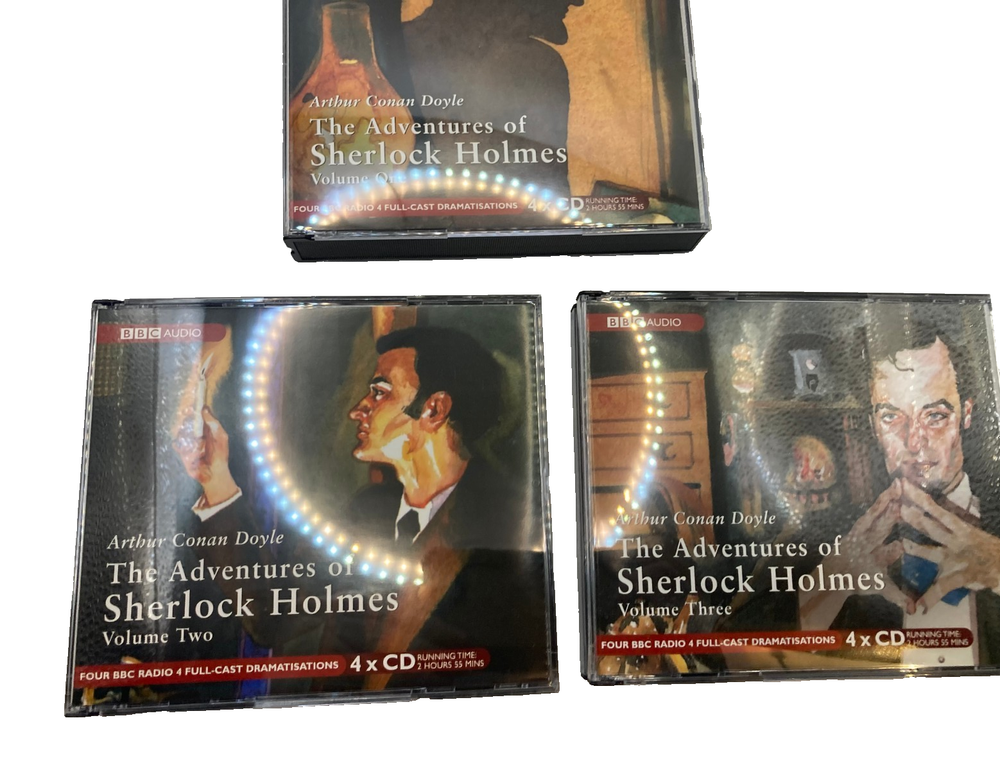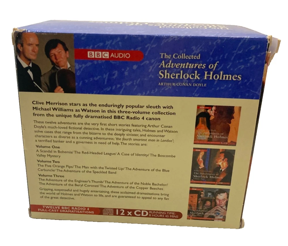 BBC Audio 12-CD box set of The Collected Adventures of Sherlock Holmes (Clive Merrison & Michael Williams). Complete set containing Volumes 1, 2 and 3, each with four full-cast BBC Radio 4 dramatisations. DETAILS • BBC Audio • 12-CD set (3 volumes, 4 CDs each) • Full-cast BBC Radio 4 dramatisations • Running time approx. 8 hours 45 mins • Manufactured in EU • Region: Not region-coded (standard audio CDs) CONDITION Very Good Condition. Discs clean. Cases very good. Slipcase has minor edge wear. FREE SHIPPING Sent boxed and well protected. Australia Post tracked parce